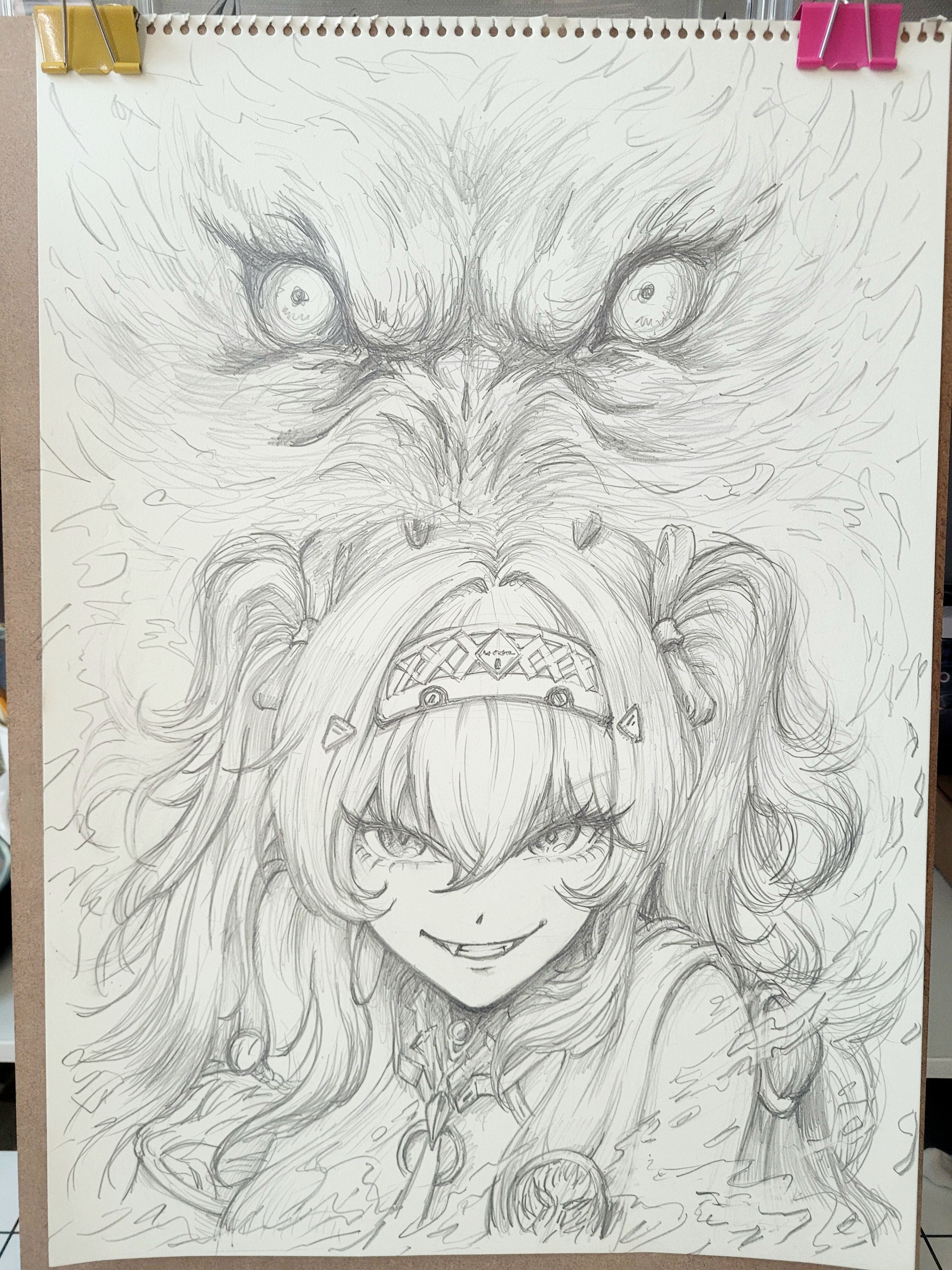 1girl absurdres animal armlet bow breasts collar graphite_(medium) grin hair_between_eyes hair_bow hair_ornament hairband highres jewelry long_hair looking_at_viewer lupa_(wuthering_waves) medium_breasts missing_commentary multiple_hair_bows papatouch portrait smile solo straight-on traditional_media twintails wolf wuthering_waves