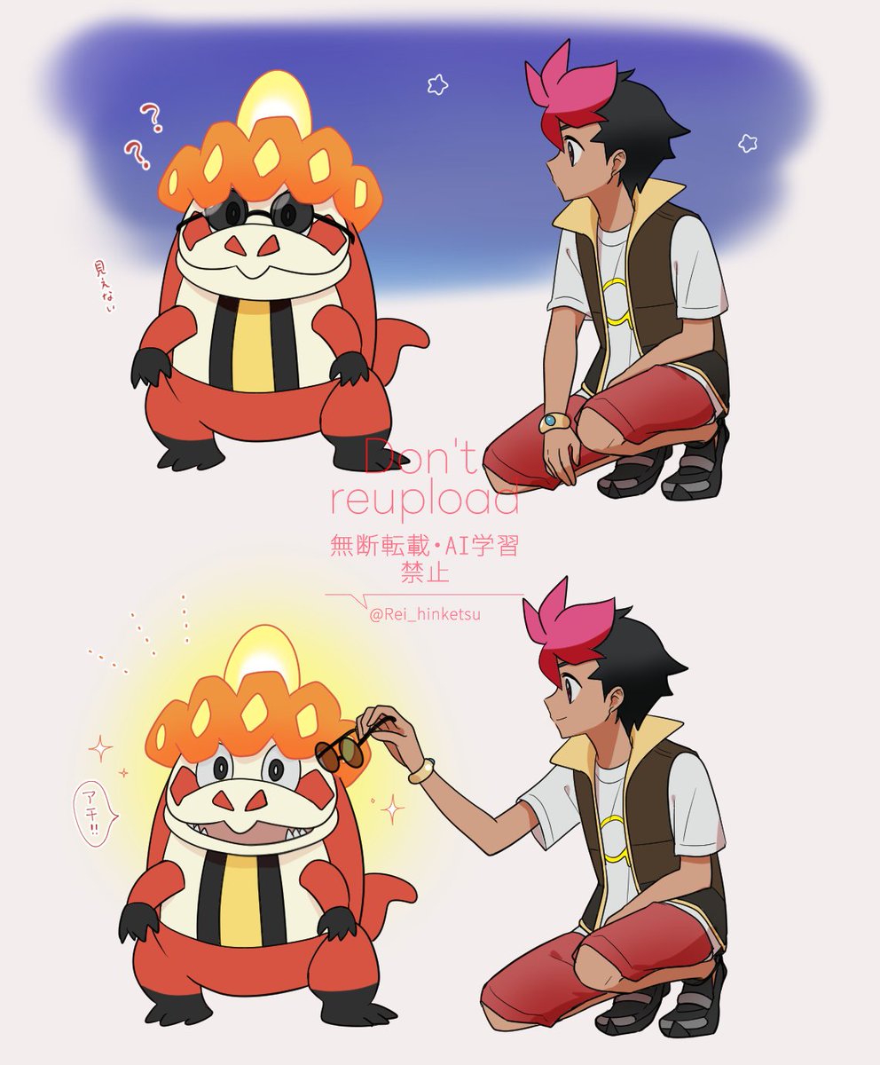 1boy ? ?? black_hair black_shoes bracelet brown_vest closed_mouth commentary_request crocalor hand_up highres holding holding_removed_eyewear jewelry male_focus multicolored_hair nintendo open_clothes open_vest pink_hair pokemon pokemon_(anime) pokemon_horizons red_shorts rei_hinketsu roy_(pokemon) shirt shoes short_hair short_sleeves shorts smile squatting t-shirt translation_request twitter_username two-tone_hair unworn_eyewear vest watermark white_shirt