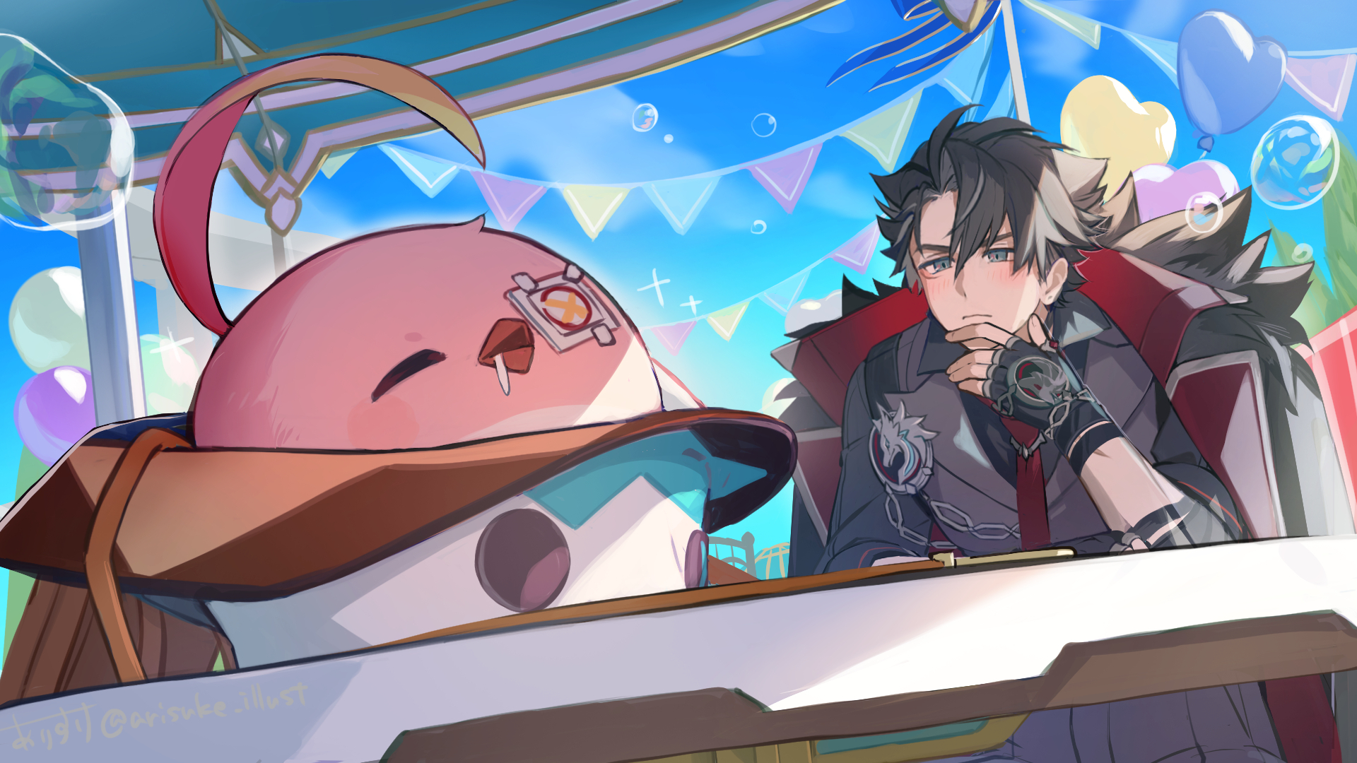 1boy arisuke_(natuyan) balloon bandaged_arm bandages bird black_coat black_gloves black_hair black_shirt blue_eyes blue_sky blush bubble cacucu_(genshin_impact) chain closed_eyes closed_mouth cloud coat coat_on_shoulders collared_shirt commentary_request cowboy_hat day eyepatch facial_scar fingerless_gloves fur-trimmed_coat fur_trim genshin_impact gloves grey_hair grey_vest hair_between_eyes hand_up hat highres male_focus medical_eyepatch multicolored_hair necktie one_eye_covered open_mouth outdoors parted_bangs red_necktie scar scar_on_arm scar_on_cheek scar_on_face shirt short_hair short_sleeves sky sleeping solo streaked_hair string_of_flags table two-sided_coat two-sided_fabric vest white_hat wriothesley_(genshin_impact)
