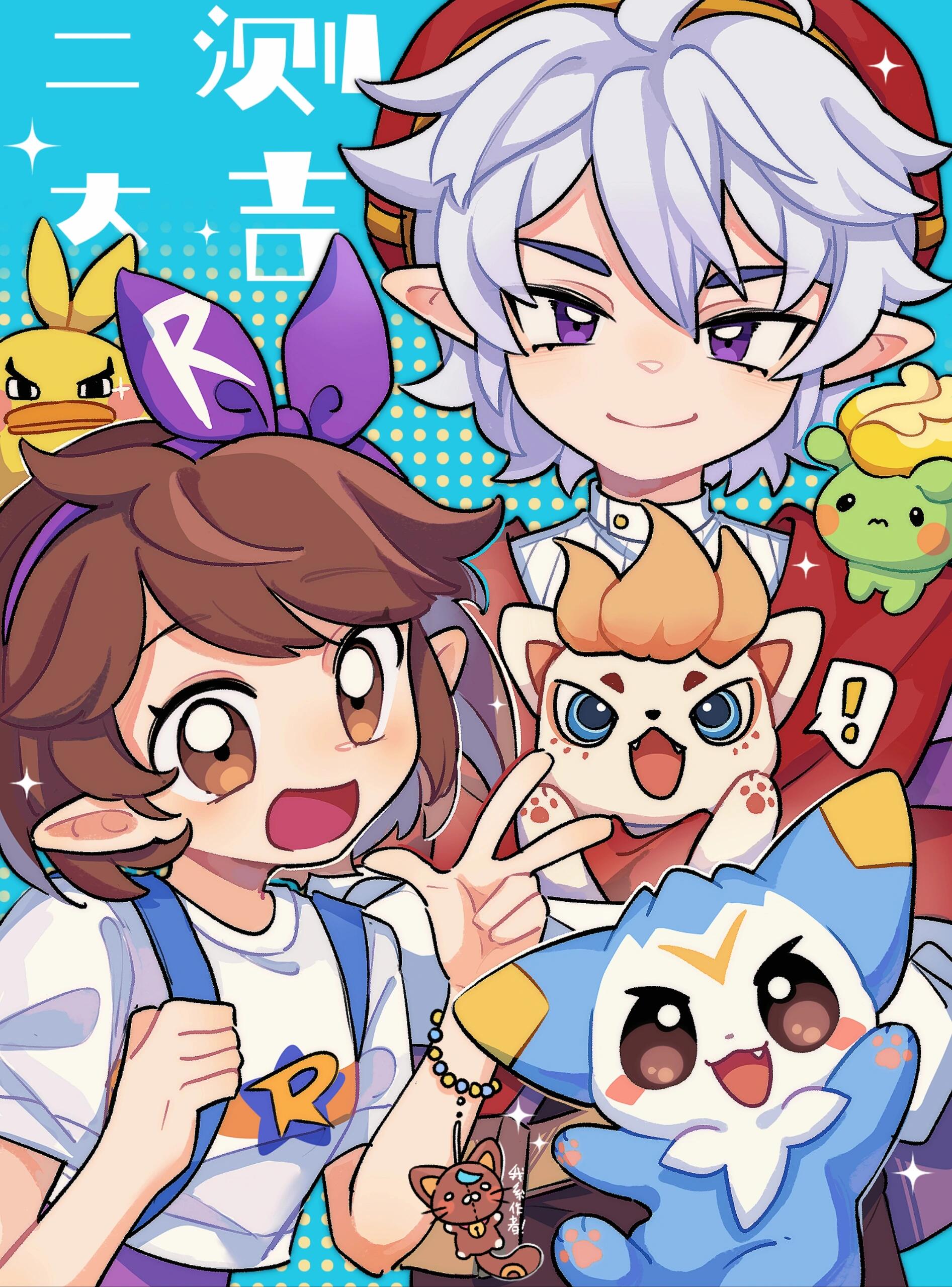 ! 1boy 1girl absurdres bad_source bag bracelet brown_eyes brown_hair chinese_text dream_(roco_kingdom:_world) enzo_(roco_kingdom:world) grey_hair hairband hat highres jewelry looking_at_viewer multiple_boys open_mouth pointy_ears purple_eyes roco_kingdom:_world shirt short_hair shun_zhi_yuanwei_ji smile v white_hair white_shirt