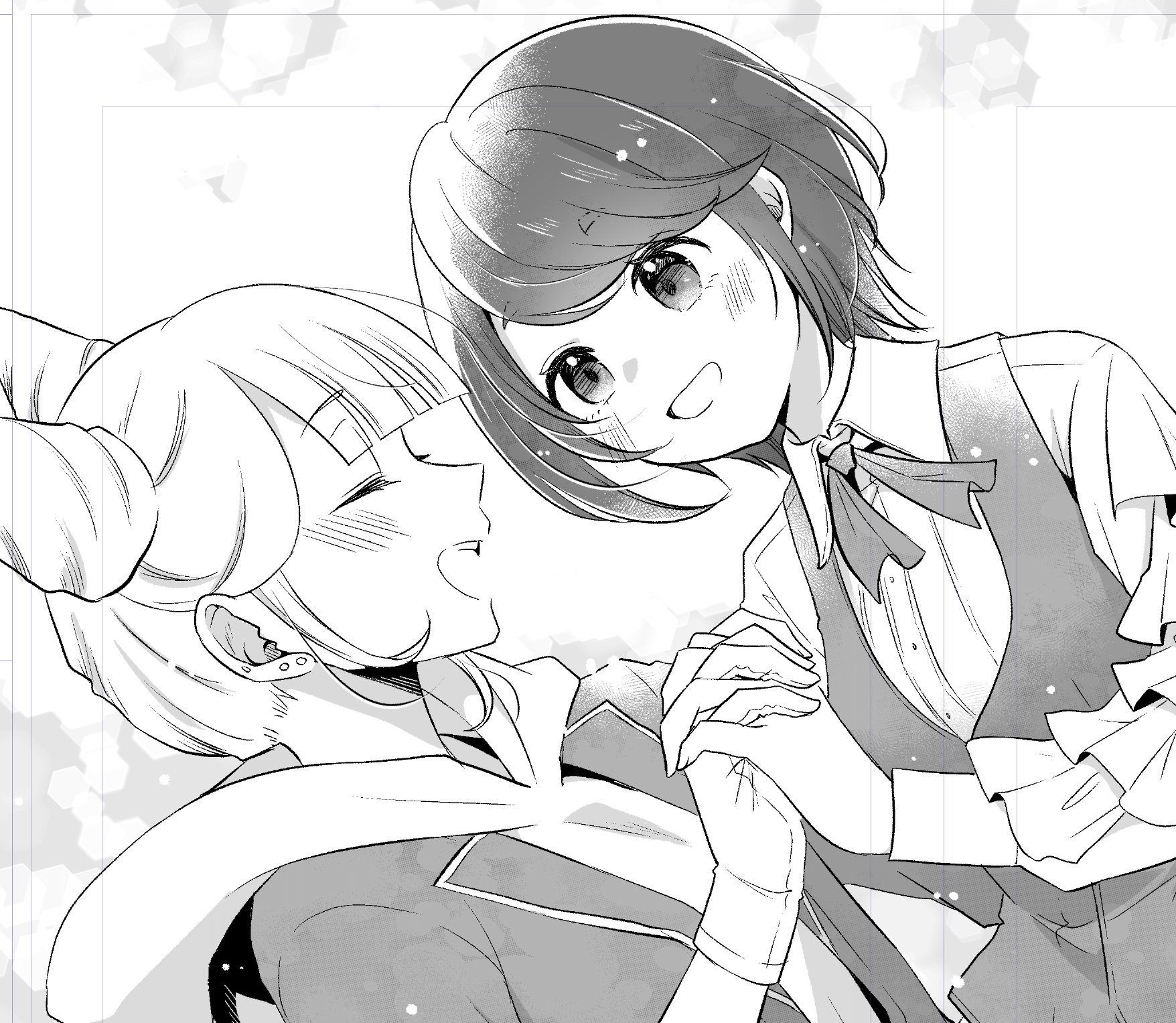 2girls :d blush closed_eyes collared_shirt commentary_request cone_hair_bun double_bun frilled_shirt frilled_sleeves frills fukurai_azami greyscale hair_bun happy highres holding_hands hood hood_down interlocked_fingers jasmine_(toshi_densetsu_kaitai_center) jumpsuit long_sleeves looking_at_another misaking0212 monochrome multiple_girls neck_ribbon open_mouth profile ribbon shirt short_hair smile standing swept_bangs toshi_densetsu_kaitai_center upper_body