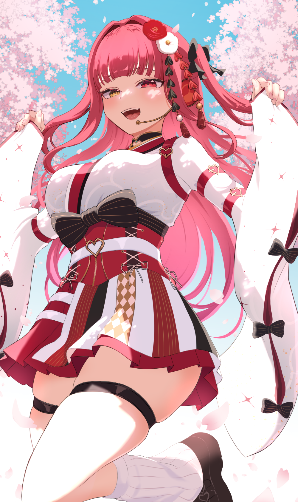 1girl black_bow black_shoes blue_sky blush bow breasts cherry_blossoms corset day falling_petals flower hair_bow hair_flower hair_ornament happy heart heterochromia highres holding_sleeve hololive houshou_marine houshou_marine_(11th_costume) large_breasts leg_warmers long_hair long_sleeves looking_at_viewer microphone official_alternate_costume open_mouth outdoors petals red_hair ruaruayana shoes sky smile solo standing standing_on_one_leg striped_bow thigh_strap very_long_hair virtual_youtuber white_leg_warmers wide_sleeves