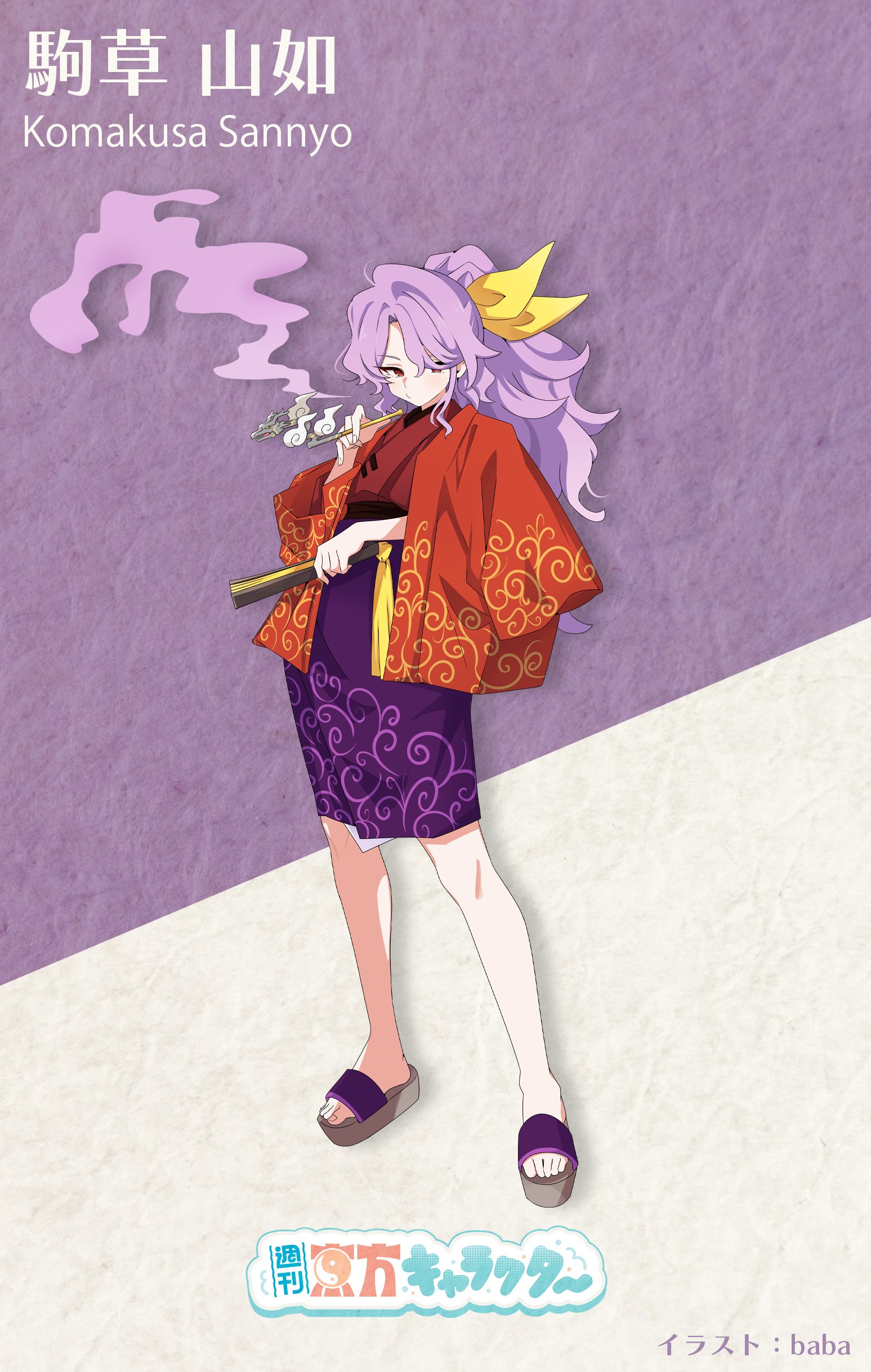 1girl absurdres baba_(baba_seimaijo) full_body geta hair_ribbon hand_fan high_ponytail highres holding holding_fan holding_smoking_pipe japanese_clothes kimono komakusa_sannyo looking_at_viewer ponytail print_kimono print_skirt purple_hair purple_skirt red_eyes red_kimono ribbon second-party_source skirt smoking_pipe solo touhou wide_sleeves yellow_ribbon