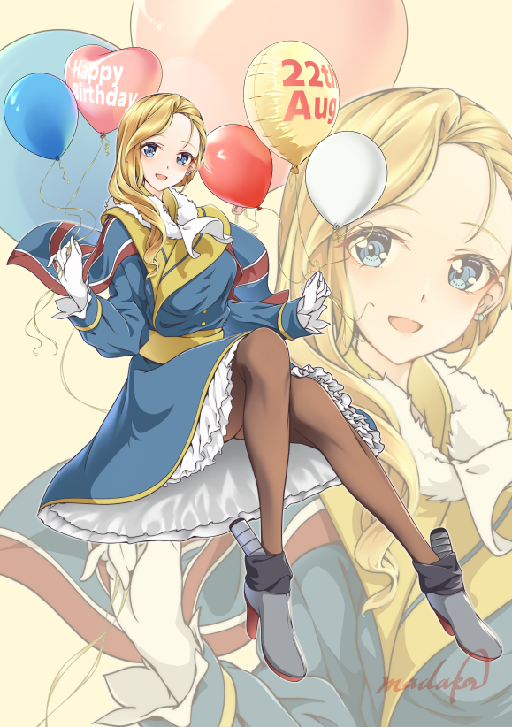 1girl azur_lane balloon blonde_hair blue_capelet blue_dress blue_eyes blush boots breasts brown_pantyhose capelet dress earrings gloves hair_over_shoulder happy_birthday hat heart_balloon hood_(azur_lane) jewelry large_breasts long_hair looking_at_viewer madakov_kodima pantyhose signature sitting smile solo union_jack unworn_hat unworn_headwear white_gloves zoom_layer