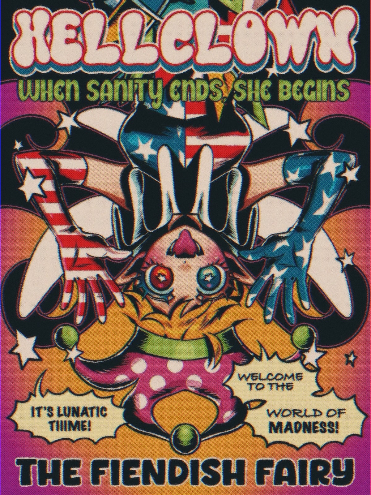 1girl american_flag american_flag_gloves american_flag_print blonde_hair blue_eyes clownpiece english_text fairy_wings flag_print gloves hat heterochromia highres mememedama10 neck_ruff pointy_ears polka_dot_headwear poster_(medium) print_gloves purple_hat red_eyes solo speech_bubble tongue tongue_out touhou upside-down wings