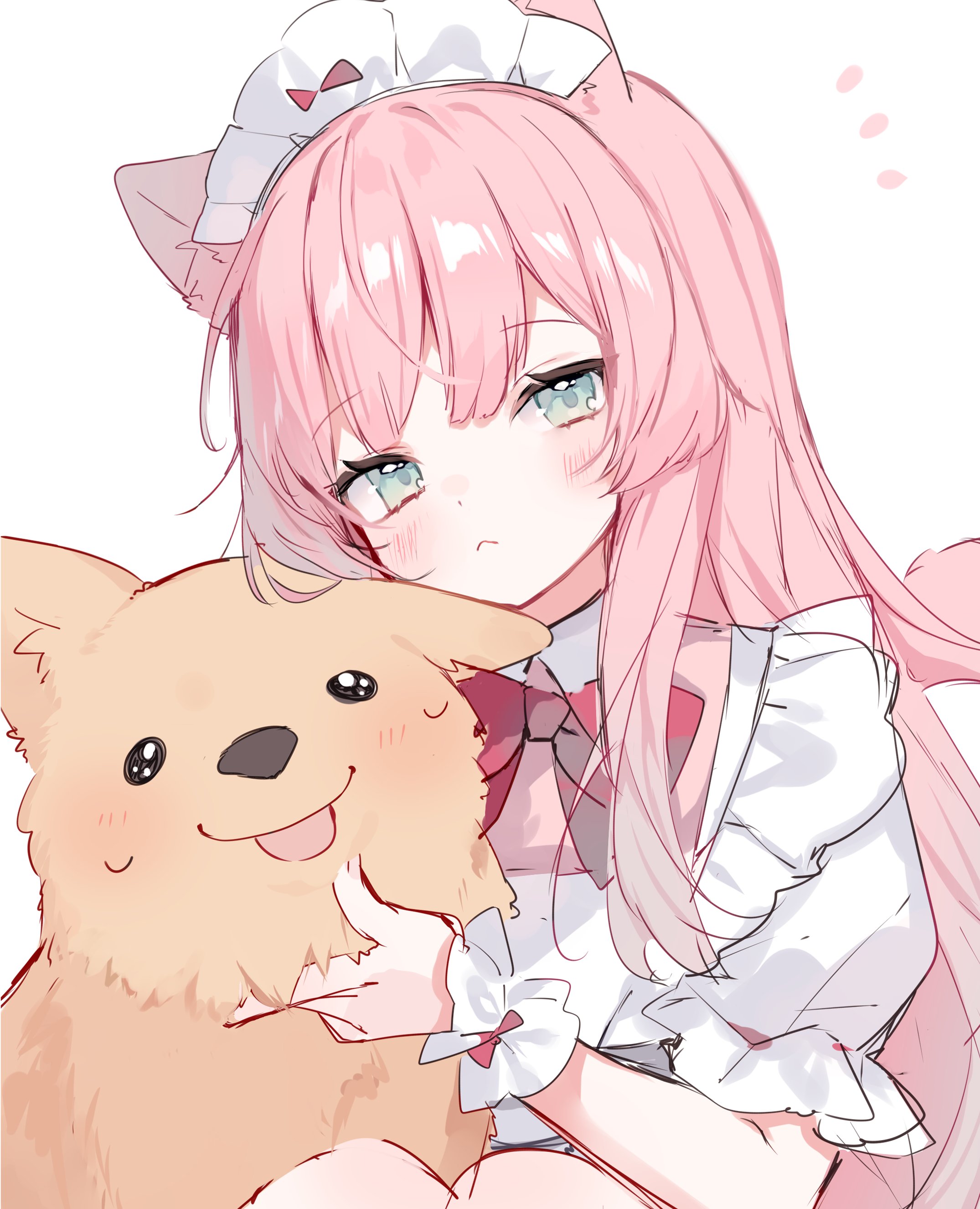 1girl absurdres animal_ears apron brown_fur character_request closed_mouth copyright_request dog dog_ears dog_girl highres long_hair maid_headdress mokyuko neck_ribbon pink_background pink_hair puffy_short_sleeves puffy_sleeves red_ribbon ribbon short_sleeves simple_background sitting smile solo tongue tongue_out upper_body white_apron white_background white_headdress