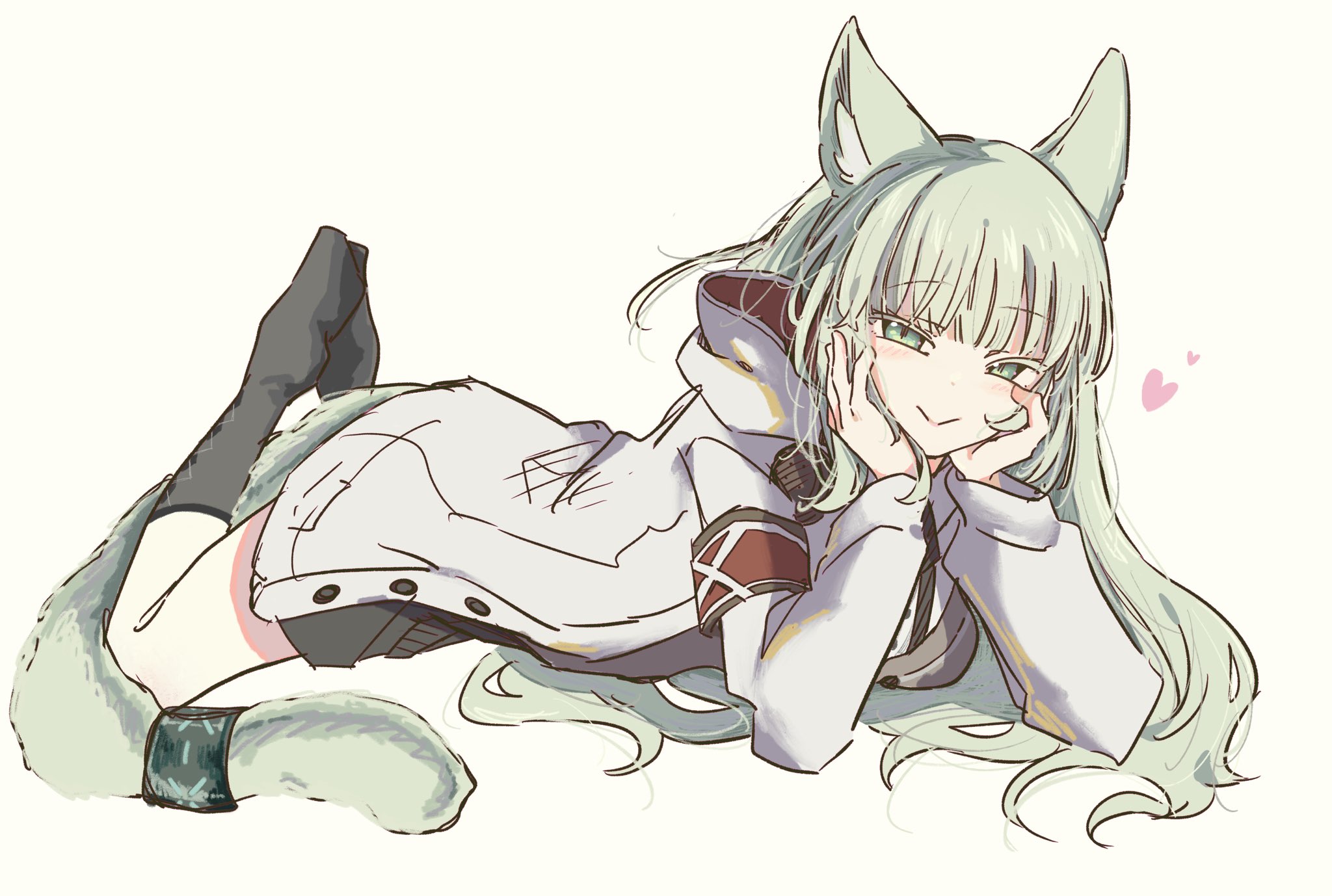 1girl animal_ear_fluff animal_ears arknights armband black_socks cardigan cat_ears cat_girl cat_tail green_eyes green_hair green_tail grey_cardigan grey_socks hands_on_own_cheeks hands_on_own_face harmonie_(arknights) highres hood hoodie looking_at_viewer lying nasubi_no_manjiu no_shoes on_stomach simple_background socks solo tail tail_ornament tail_ring white_background white_hoodie
