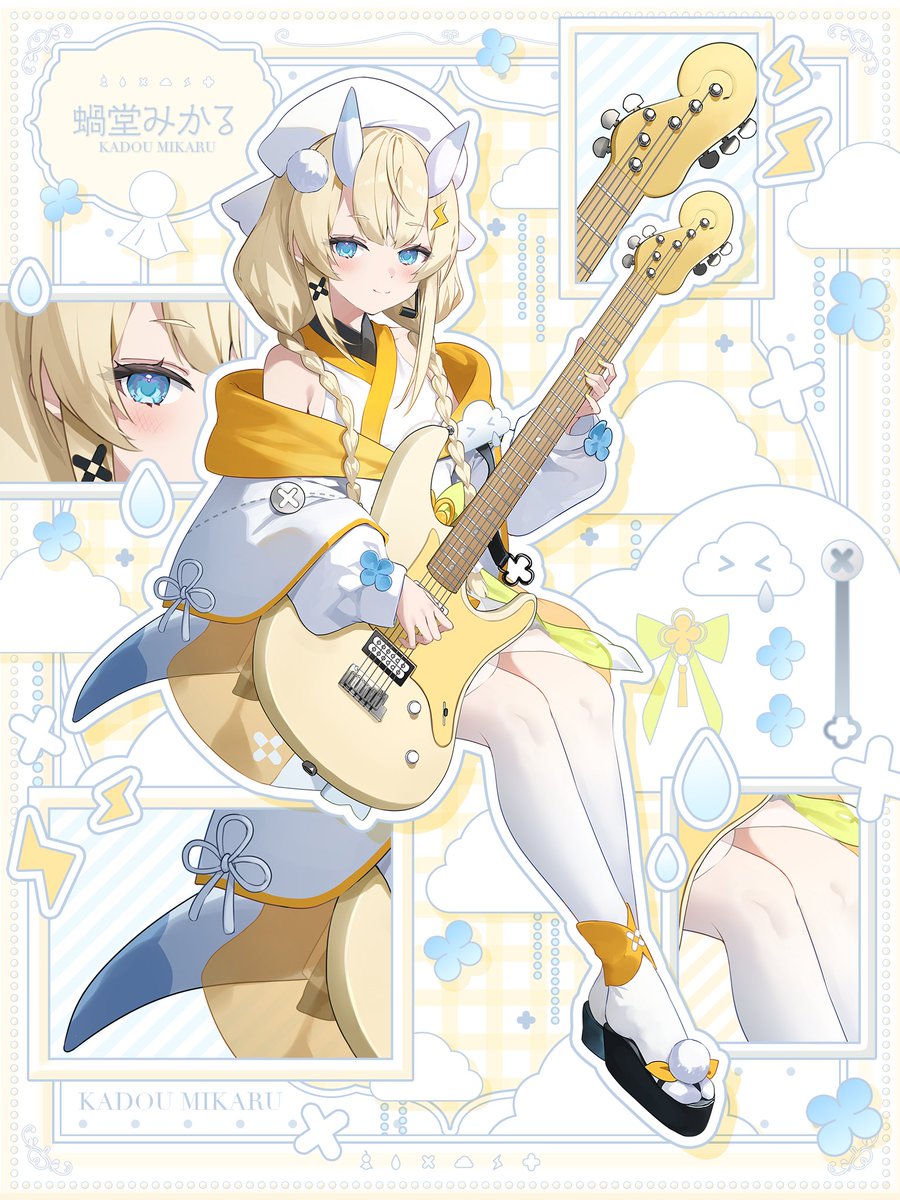 1girl amagasa_yun ankleband bare_shoulders blonde_hair blue_eyes blue_horns blue_tail blush bow braid character_name flower_knot footwear_bow full_body gradient_pantyhose guitar hair_ornament hair_over_shoulder hat headset highres holding holding_guitar holding_instrument horns instrument invisible_chair jacket japanese_clothes kadou_mikaru kimono lightning_bolt lightning_bolt_hair_ornament lightning_bolt_symbol looking_at_viewer low_twin_braids multicolored_horns nijisanji off_shoulder official_art okobo outline pantyhose platform_sandals pom_pom_(clothes) pom_pom_footwear pom_pom_hair_ornament puffy_sleeves sandals screw sidelocks sitting solo twin_braids two-tone_horns two-tone_tail virtual_youtuber white_hat white_horns white_jacket white_kimono white_outline white_pantyhose white_tail x_hair_ornament yellow_bow yellow_trim zoom_layer