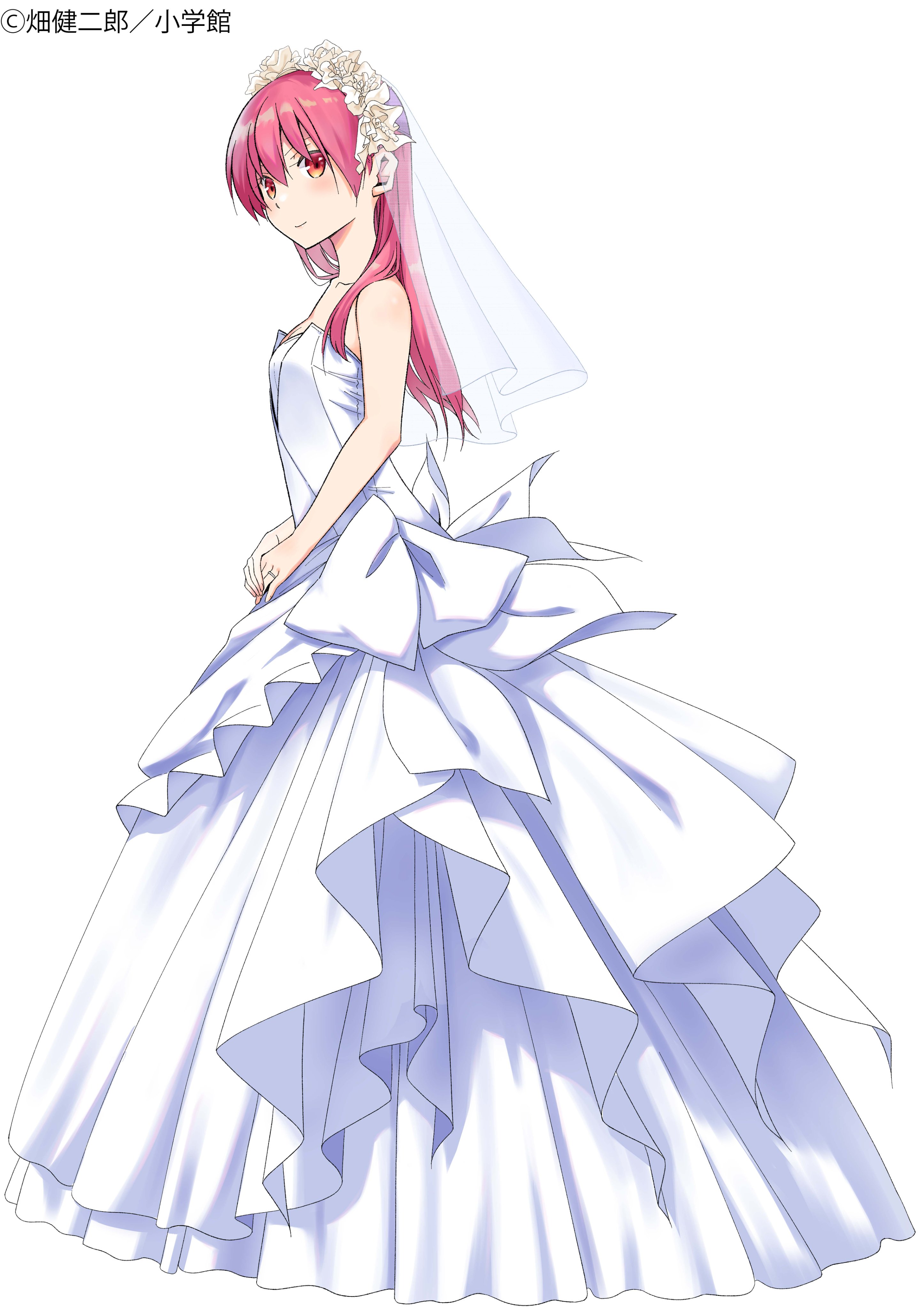 1girl absurdres blush breasts bridal_veil bride closed_mouth copyright_logo dress hair_between_eyes hata_kenjirou highres jewelry logo long_hair looking_at_viewer official_art pink_hair red_eyes ring simple_background smile solo standing tonikaku_kawaii veil wedding_dress wedding_ring white_background white_dress yuzaki_tsukasa