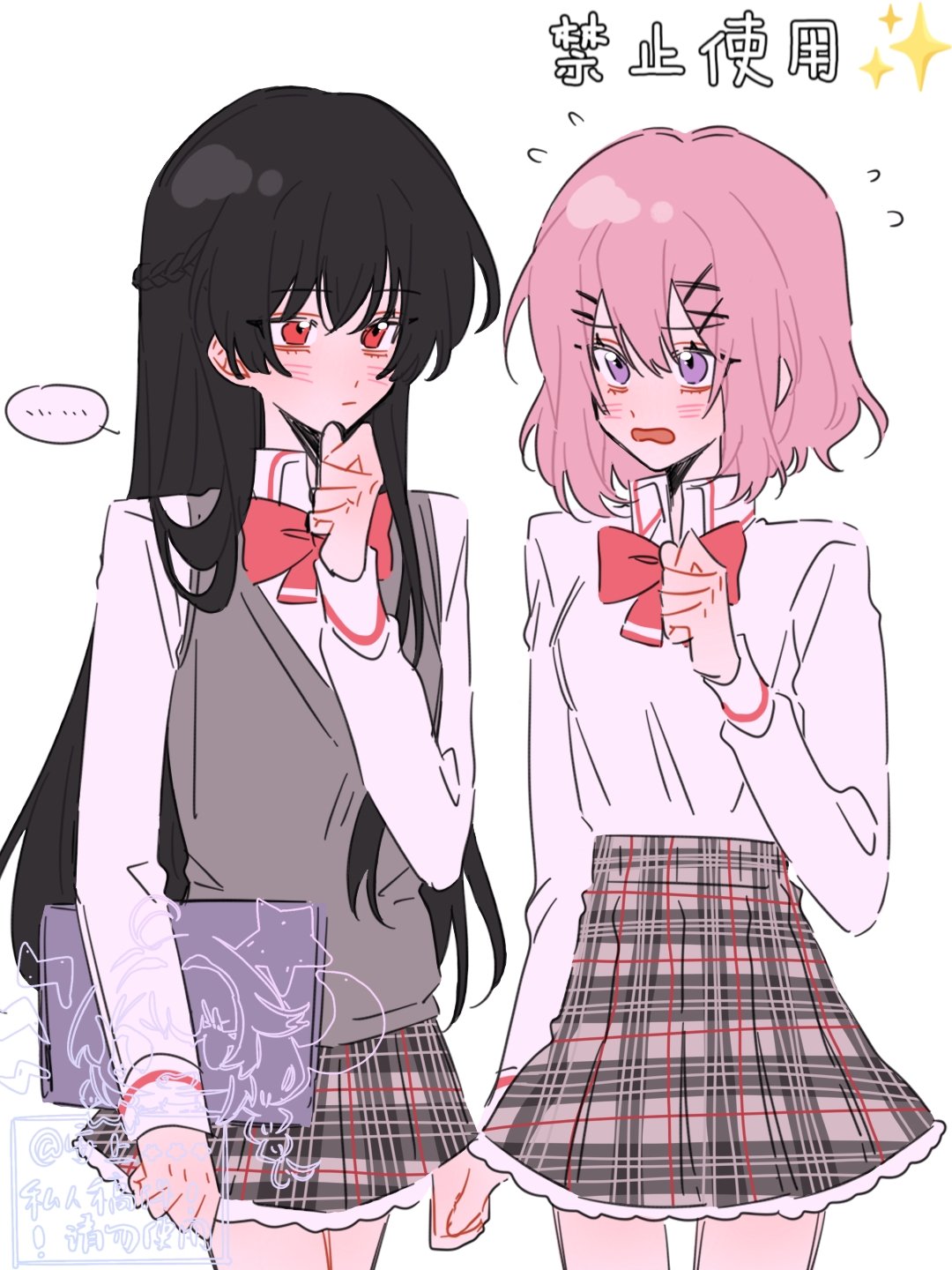 ... 2girls amaori_renako anshang0125 black_hair bow bowtie braid commentary grey_skirt grey_sweater_vest hair_ornament hairclip half_up_braid hashtag-only_commentary highres koto_satsuki long_hair long_sleeves multiple_girls parallel_hairclips pink_hair plaid_clothes plaid_skirt purple_eyes red_bow red_bowtie red_eyes school_uniform shirt simple_background skirt spoken_ellipsis sweater_vest watashi_ga_koibito_ni_nareru_wake_naijan_murimuri! white_background white_shirt