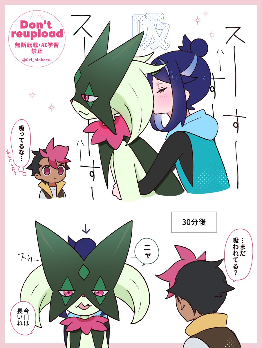 1boy 1girl arrow_(symbol) black_hair blue_hair border brown_vest commentary_request hair_bun hood hood_down hooded_vest hoodie liko_(pokemon) meowscarada multicolored_hair nintendo outside_border pink_border pink_hair pokemon pokemon_(anime) pokemon_(creature) pokemon_horizons rei_hinketsu roy_(pokemon) shirt short_hair speech_bubble swept_bangs thought_bubble translation_request twitter_username two-tone_hair vest watermark white_background