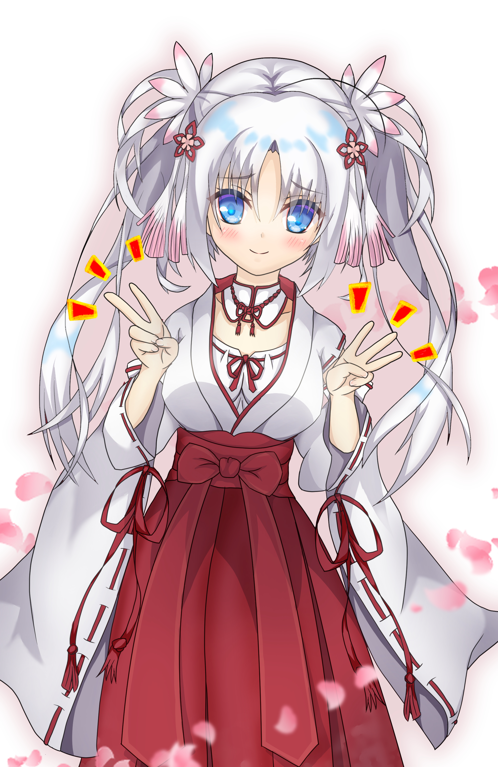 1girl absurdres anniversary blue_eyes blue_pupils blush bow skirt_bow breasts closed_mouth commentary_request detached_collar eyes_visible_through_hair falling_petals feet_out_of_frame flower furrowed_brow hair_between_eyes hair_flower hair_ornament hakama hakama_skirt hands_up highres japanese_clothes kimono large_breasts long_hair long_sleeves looking_at_viewer neck_tassel nontraditional_miko notice_lines petals red_bow red_hakama ribbon-trimmed_sleeves ribbon_trim sabarusu0130 senren_banka sidelocks simple_background skirt smile solo standing tassel tomotake_yoshino twintails v very_long_hair white_background white_flower white_hair white_kimono wide_sleeves