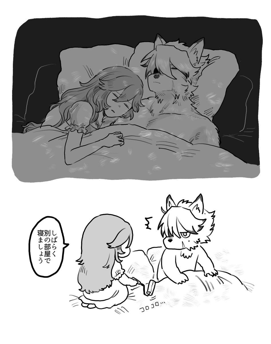 1boy 1girl alexandrina_sebastiane brown_hair chibi couple highres long_hair monochrome short_hair simple_background sleepwear victoria_housekeeping_co._(zenless_zone_zero) von_lycaon white_hair wodon_(neotidon) zenless_zone_zero