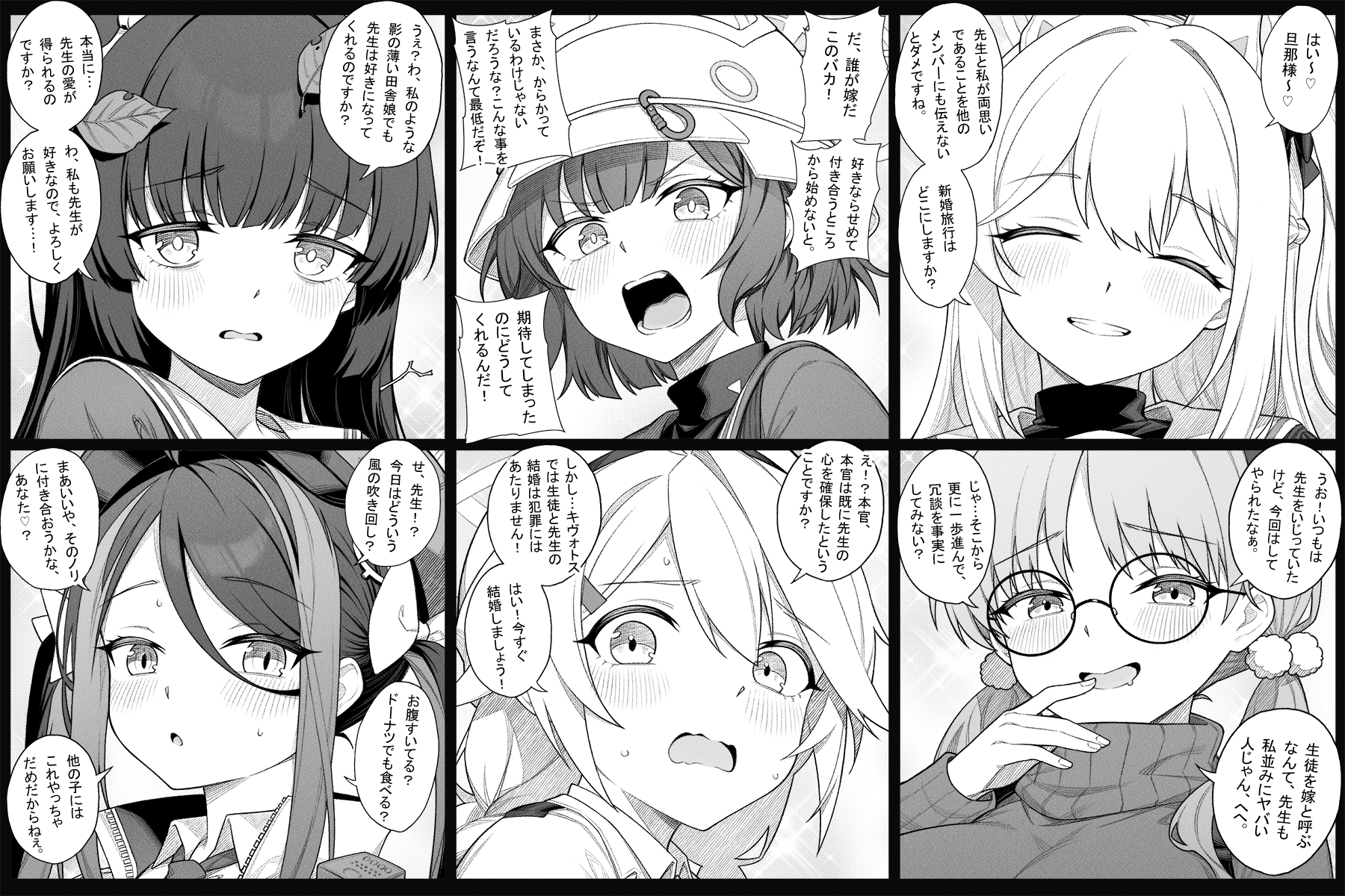 6+girls animal_ear_hairband animal_ears blue_archive blush closed_eyes combat_helmet fake_animal_ears fubuki_(blue_archive) greyscale grin hair_between_eyes hairband helmet highres jacket kirino_(blue_archive) long_hair low_twintails miyako_(blue_archive) miyu_(blue_archive) moe_(blue_archive) monochrome multiple_girls necktie open_mouth rabbit_ear_hairband rabbit_ears rabbit_platoon_(blue_archive) sailor_collar saki_(blue_archive) shirt short_hair sidelocks smile sweatdrop twintails zhong_zi_sheliu