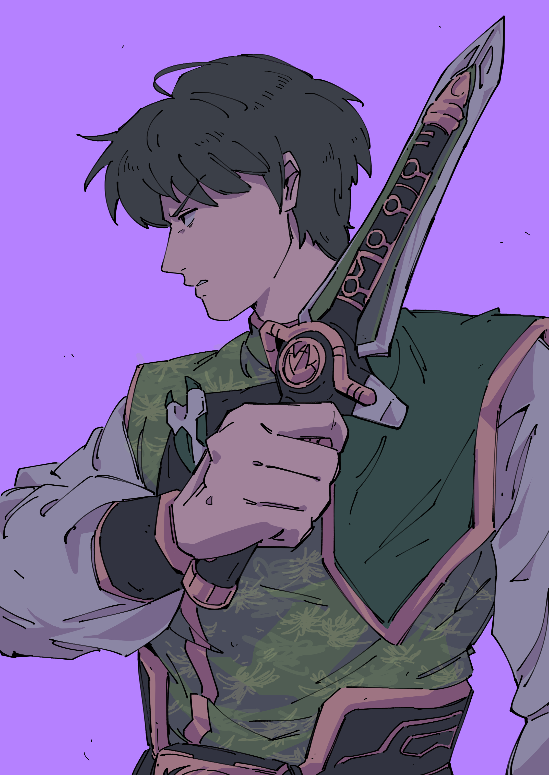 1boy absurdres burai dragon_ranger grimace highres holding holding_sword holding_weapon kyouryuu_sentai_zyuranger long_sleeves looking_to_the_side male_focus messy_hair mori_(enignuma797) purple_background short_hair simple_background solo super_sentai sword upper_body v-shaped_eyebrows weapon