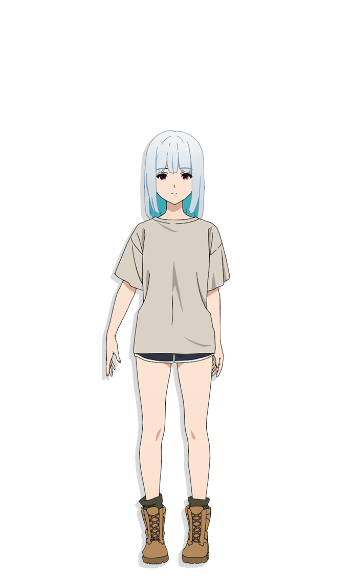 1girl anime_coloring blue_shorts boots breasts brown_boots brown_shirt child closed_mouth full_body looking_at_viewer lulu_(bang_bravern) medium_hair motomura_kouichi official_art open_hands red_eyes shirt short_shorts shorts simple_background small_breasts solo standing t-shirt thighs transparent_background white_hair yuuki_bakuhatsu_bang_bravern
