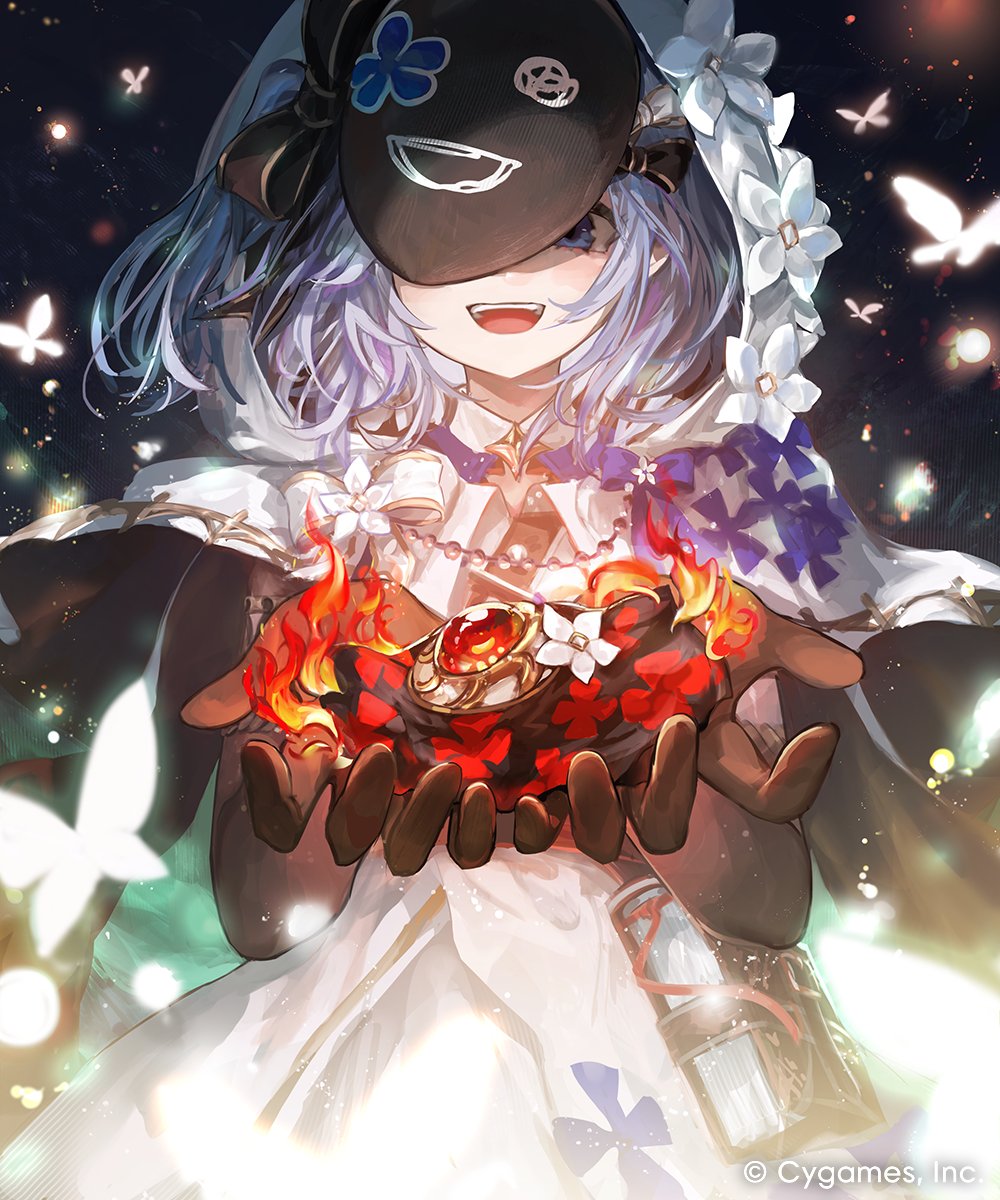 1girl black_gloves black_mask blue_eyes book book_holster bow bug butterfly capelet commentary_request company_name dress edelweiss_(shadowverse) elbow_gloves flower gloves grey_hair hair_bow highres holding hood hood_up hooded_capelet insect looking_at_viewer makihitsuji official_art one_side_up open_mouth shadowverse shadowverse:_worlds_beyond simple_background smile solo standing teeth upper_body upper_teeth_only white_capelet white_dress white_flower