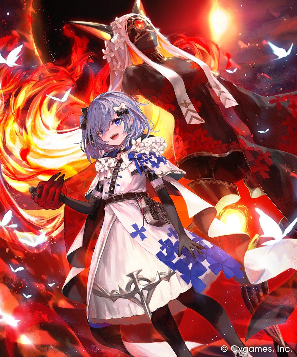 1girl 1other animal_ears belt black_gloves black_pantyhose blue_eyes book book_holster bow breasts brown_belt bug butterfly capelet commentary_request company_name cowboy_shot dark doll dress edelweiss_(shadowverse) elbow_gloves facing_viewer fire flower gloves glowing grey_hair hair_bow highres holding_hands hood hood_down hooded_capelet insect large_breasts looking_at_viewer makihitsuji mountain official_art one_side_up open_mouth outdoors pantyhose shadowverse shadowverse:_worlds_beyond smile standing teeth upper_teeth_only white_capelet white_dress white_flower white_hair