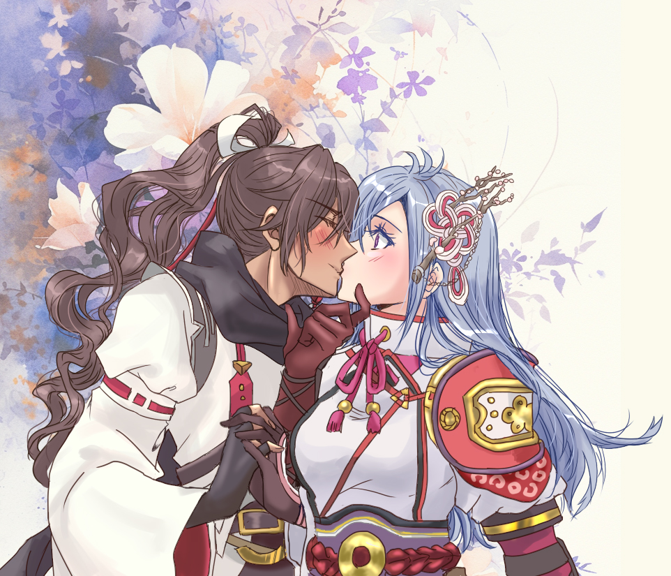 brown_hair fingerless_gloves gloves grabbing_another's_chin hair_ornament hand_on_another's_chin japanese_clothes kaguya_(rune_factory) kiss ponytail rune_factory rune_factory:_guardians_of_azuma starlottex subaru_(rune_factory) tan tassel tassel_hair_ornament white_hair