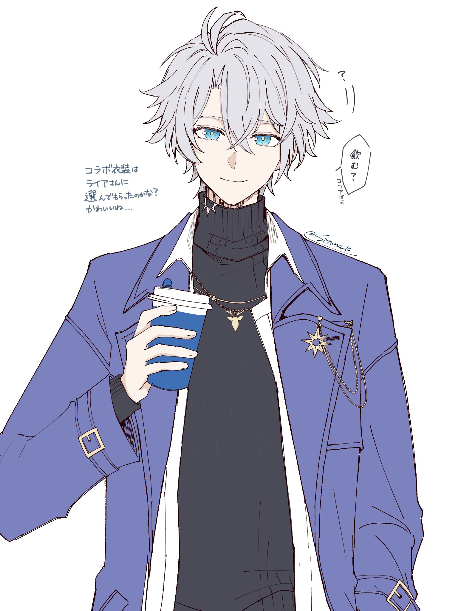 1boy antenna_hair black_sweater blue_eyes coat cup grey_hair hair_between_eyes highres holding holding_cup honkai:_star_rail honkai_(series) male_focus official_alternate_costume open_clothes open_coat open_shirt parted_bangs phainon_(honkai:_star_rail) phainon_(luckin_coffee)_(honkai:_star_rail) purple_coat shirt short_hair simple_background situno_10 solo speech_bubble sweater translation_request turtleneck turtleneck_sweater white_background white_shirt yellow_pupils