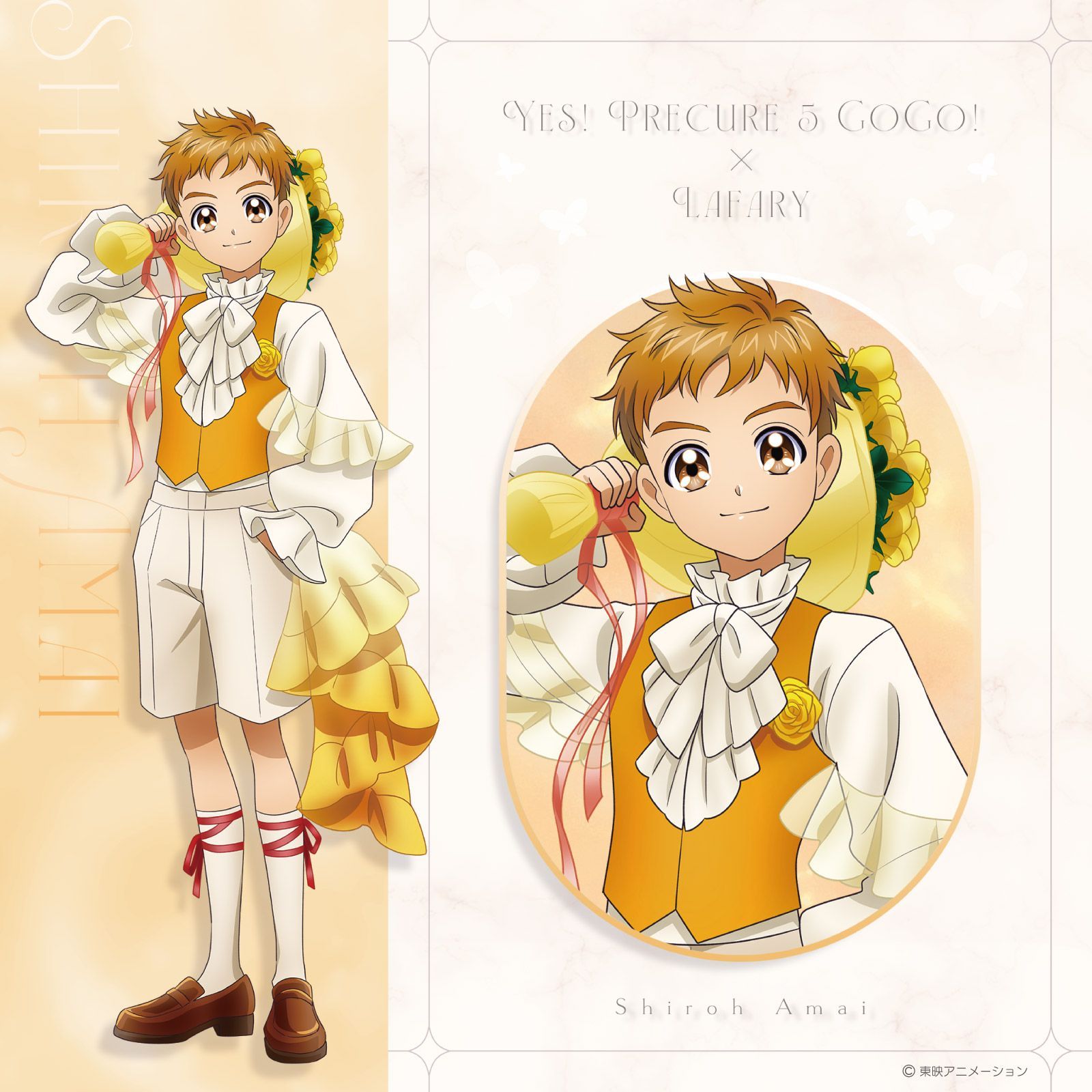 1boy amai_shirou amai_shirou_(lafary) bouquet brown_eyes brown_hair commentary_request flower hand_in_pocket highres holding holding_bouquet light_smile loafers long_sleeves male_focus official_alternate_costume official_art precure puffy_long_sleeves puffy_sleeves red_ribbon ribbon rose see-through_clothes shoes short_hair shorts solo solo_focus syrup_(precure) thick_eyebrows very_short_hair yellow_flower yellow_rose yes!_precure_5 yes!_precure_5_gogo!
