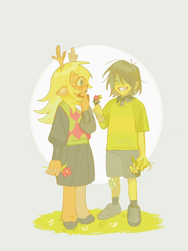 1girl 1other aged_down animal_ears antlers bkbkbkt black_shirt black_shoes black_shorts black_skirt black_socks blonde_hair colored_skin commentary deer_antlers deer_ears deer_girl deltarune flower furry furry_female gauze_on_knee green_shirt holding holding_flower hooves horns kris_(deltarune) long_sleeves missing_tooth noelle_holiday puffy_long_sleeves puffy_sleeves red_flower shirt shoes shorts skirt smile socks untranslatable_commentary utdr_(toby_fox) yellow_flower yellow_skin