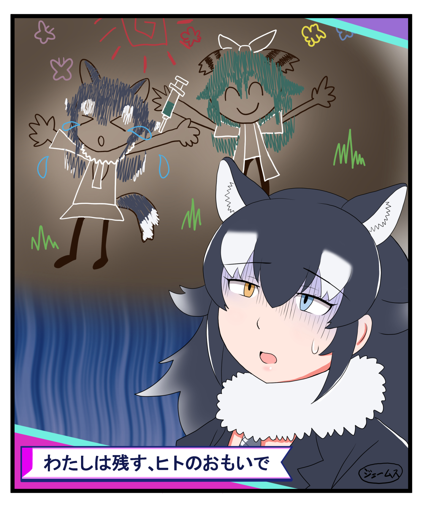 1girl animal_ears black_hair blue_eyes child's_drawing crying fur_collar gameplay_mechanics gloom_(expression) grey_wolf_(kemono_friends) heterochromia highres holding holding_syringe jmsymd1 kako_(kemono_friends) kemono_friends kemono_friends_3 long_hair long_sleeves multicolored_hair necktie open_mouth shaded_face sweatdrop syringe tail translated two-tone_hair white_hair wolf_ears wolf_girl wolf_tail yellow_eyes