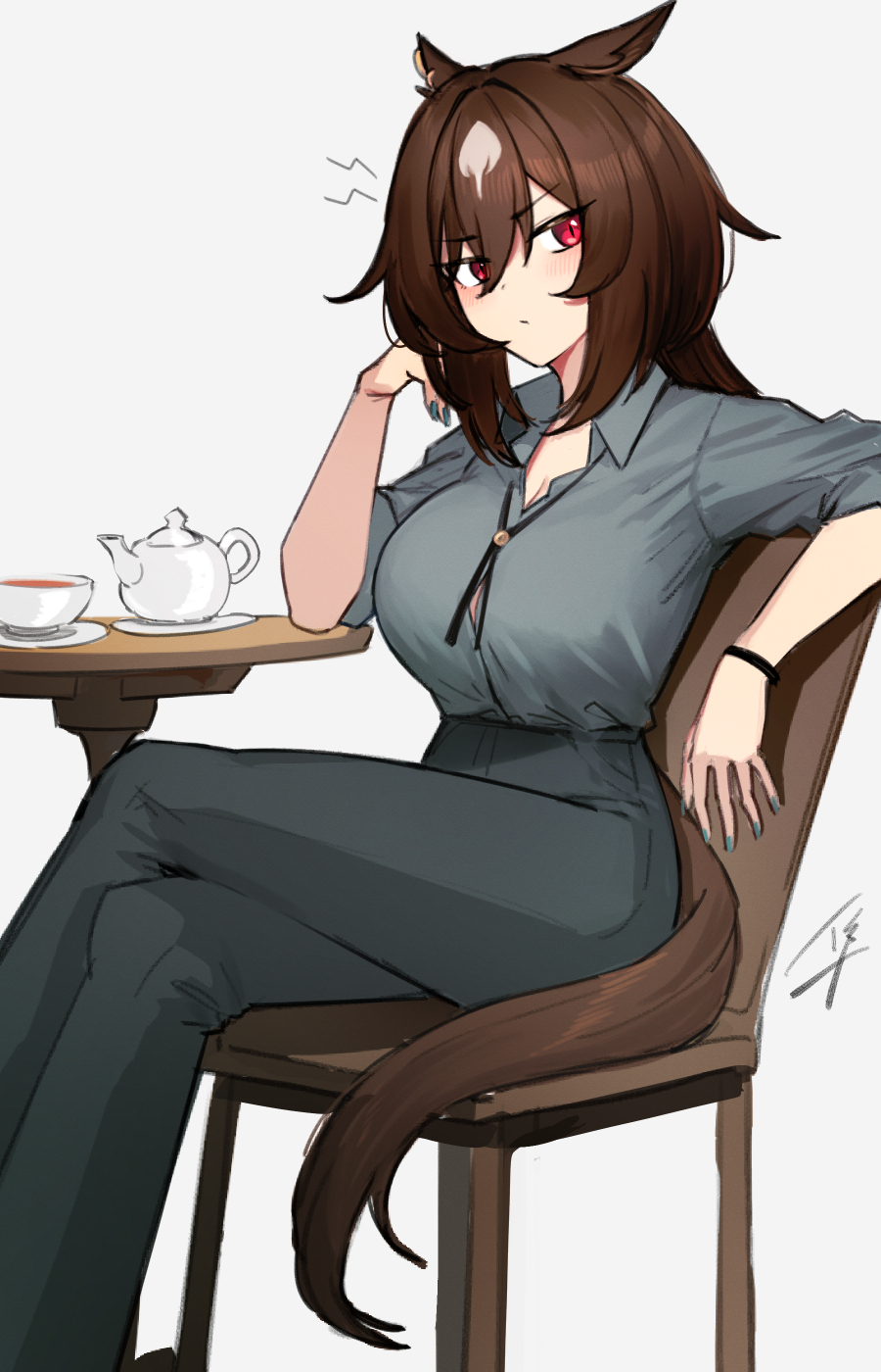 1girl animal_ears annoyed breasts brown_hair commentary_request crossed_legs cup ear_ornament hair_between_eyes hayabusa_(vert_320) highres horse_ears horse_girl horse_tail long_hair looking_at_viewer multicolored_hair plate red_eyes shirt simple_background sirius_symboli_(umamusume) sitting smile solo streaked_hair table tail tea teacup teapot umamusume white_hair