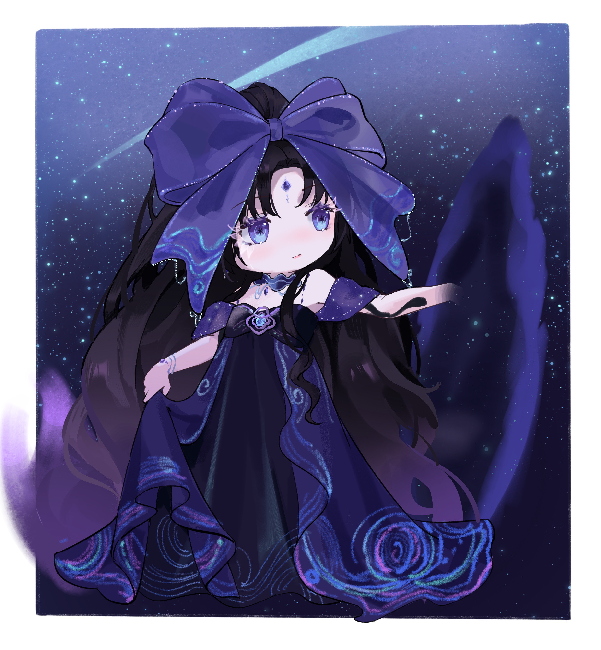 1girl absurdly_long_hair absurdres bare_shoulders black_dress black_hair black_hole border bow bracelet chibi choker colored_tips dress expressionless forehead_jewel gem godfall_omens_(shining_nikki) gown hair_bow highres holding_own_dress jewelry large_bow layered_dress light_blush lips long_dress long_hair looking_to_the_side makeup mascara multicolored_hair necklace nikki_(series) off-shoulder_dress off_shoulder parted_bangs parted_lips pink_lips purple_bow purple_choker purple_dress purple_eyes purple_gem purple_sleeves reaching shining_nikki shooting_star short_sleeves solo space very_long_hair wavy_hair white_border yutoutoutoutoutou