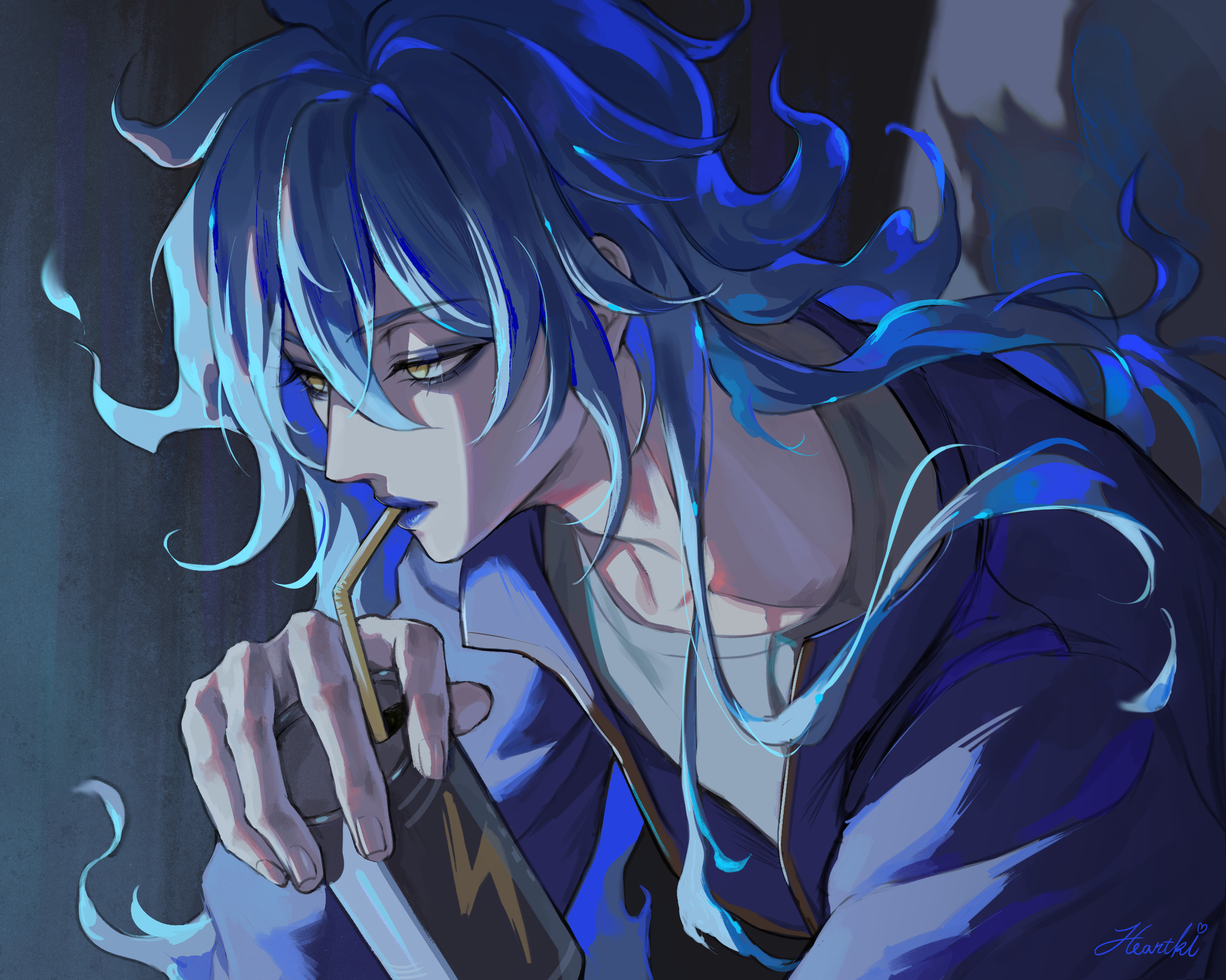 1boy blue_eyeshadow blue_hair blue_lips can commentary drinking_straw energy_drink eyeshadow grey_background grey_shirt half-closed_eyes heartki highres holding holding_can idia_shroud idia_shroud_(cozy_loungewear) looking_to_the_side makeup male_focus messy_hair shadow shirt signature simple_background solo twisted_wonderland upper_body yellow_eyes