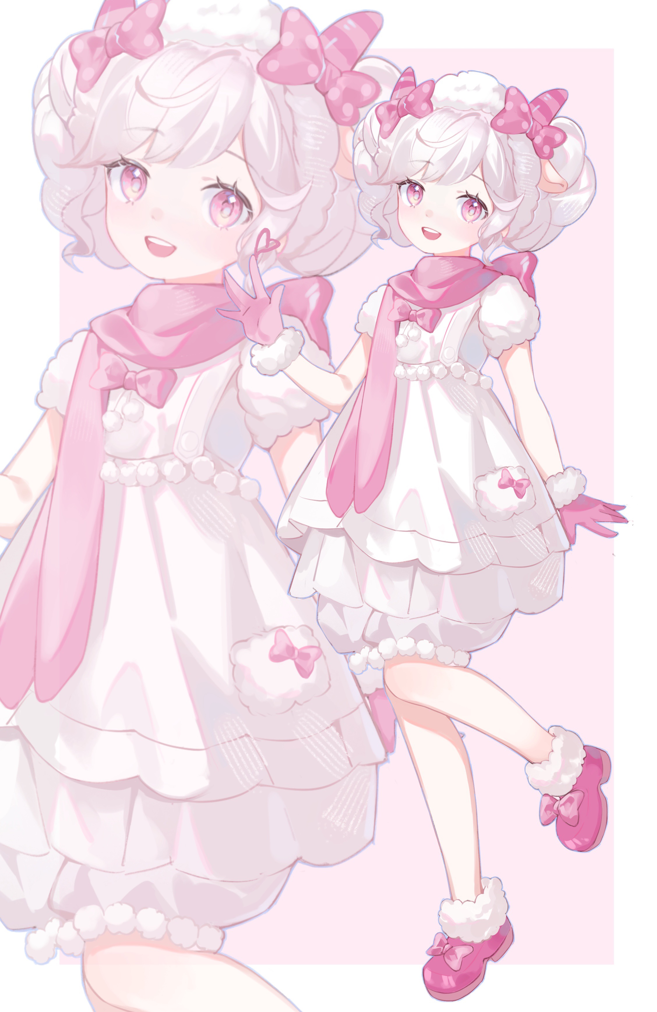 1girl absurdres animal_ears beret bloomers border bow cosplay dress extra_ears eyelashes fake_animal_ears fake_horns footwear_bow frilled_dress frills full_body fur-trimmed_gloves fur-trimmed_shoes fur_hat fur_sleeves fur_trim gloves goat_ears goat_horns grey_bloomers hair_bow hand_up happy hat highres horns light_blush loafers loose_hair_strand mei_yangyang mei_yangyang_(cosplay) nikki_(series) open_mouth outside_border pink_background pink_bow pink_eyes pink_gloves pink_horns pink_scarf pink_shoes pink_snowprint_(shining_nikki) polka_dot polka_dot_bow puffy_short_sleeves puffy_sleeves scarf shining_nikki shoes short_dress short_hair short_sleeves smile solo standing striped_horns tachi-e teeth underwear upper_teeth_only waving white_border white_dress white_hair white_hat xiyangyang_yu_huitailang yutoutoutoutoutou zoom_layer