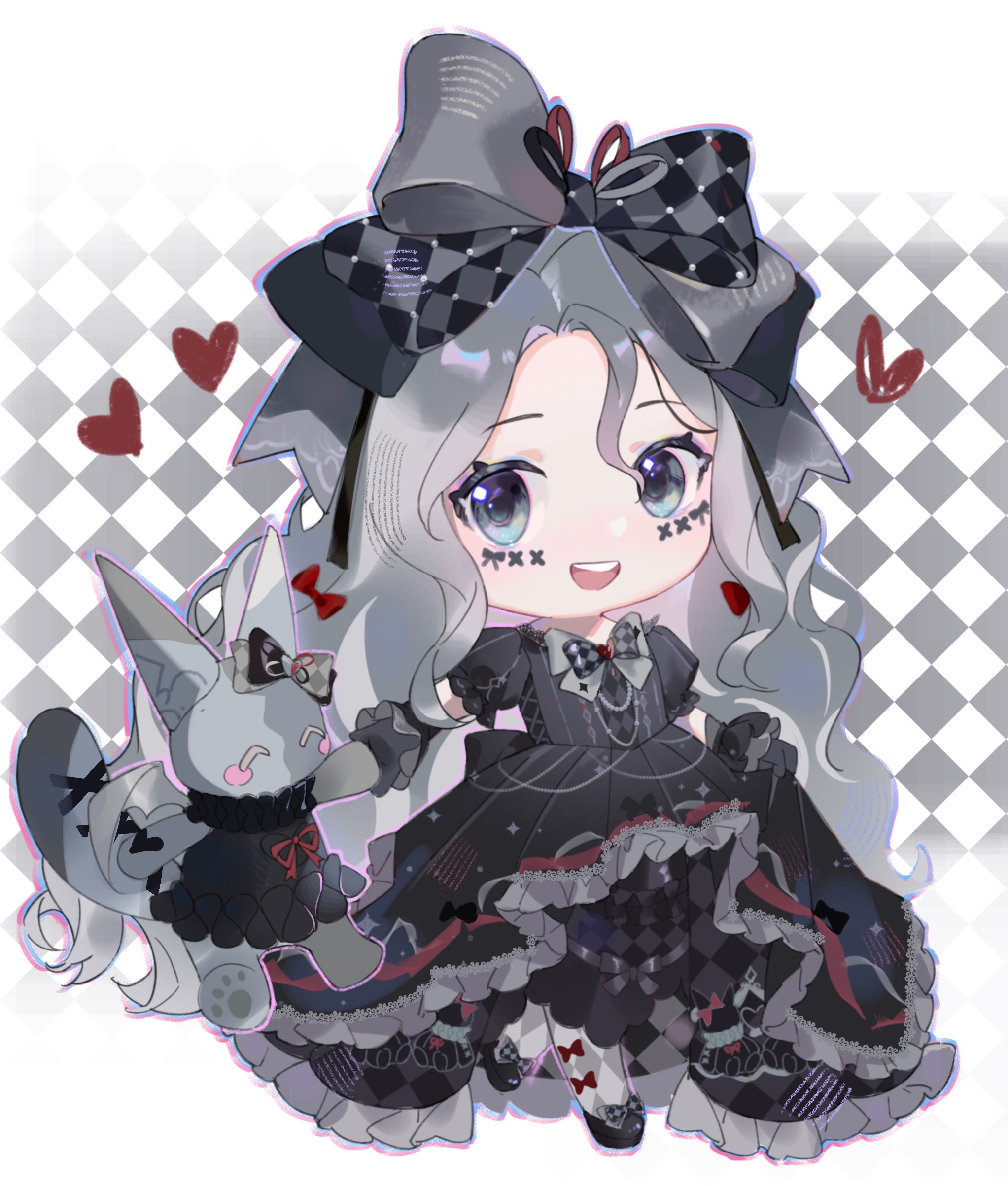 1girl absurdres argyle_background argyle_bow argyle_clothes argyle_dress black_background black_bow black_bowtie black_dress black_hair black_ribbon black_shoes black_wrist_cuffs blue_eyes border bow bow_legwear bowtie chibi crimson_rhapsody_(infinity_nikki) dress esseling_(infinity_nikki) eyelashes facepaint felispirit_sack_(infinity_nikki) footwear_bow frilled_dress frilled_wrist_cuffs frills gown grey_bow grey_pantyhose grey_ribbon hair_between_eyes hair_bow hair_ribbon happy heart highres hime_lolita holding_hands holding_own_dress infinity_nikki large_bow light_blush lolita_fashion long_hair looking_at_creature multicolored_ribbon multiple_hair_bows nikki_(series) official_alternate_color open_mouth outside_border pantyhose puffy_short_sleeves puffy_sleeves red_bow red_ribbon ribbon shoes short_sleeves smile solo teeth two-tone_background two-tone_bow two-tone_bowtie upper_teeth_only very_long_hair wavy_hair white_background white_border white_pantyhose wrist_cuffs yutoutoutoutoutou