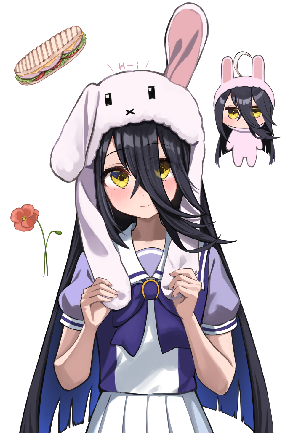 1girl ahoge animal_costume animal_ear_headwear animal_ears black_hair blue_hair bow bowtie closed_mouth colored_inner_hair cross-laced_hairband fake_animal_ears flower flower_request hair_through_headwear highres kuronosu_(yamada1230) light_blush long_hair looking_at_viewer manhattan_cafe_(umamusume) multicolored_hair multiple_views puffy_short_sleeves puffy_sleeves purple_bow purple_bowtie purple_shirt rabbit_costume rabbit_ears red_flower sailor_collar shirt shirt_tucked_in short_sleeves simple_background skirt smile two-tone_shirt umamusume very_long_hair white_background white_hair white_sailor_collar white_skirt yellow_eyes
