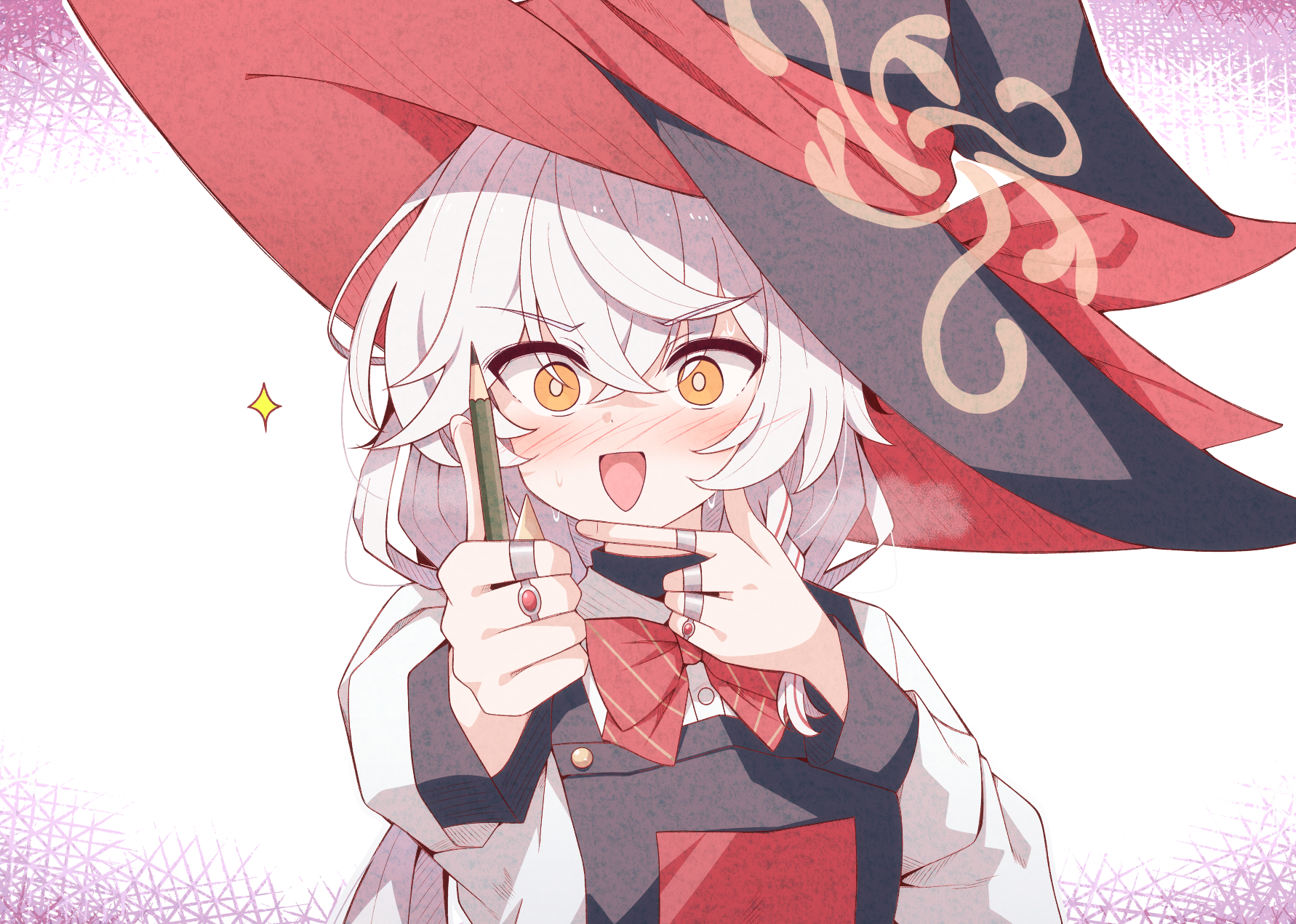 apron blue_archive blush bow bowtie braid eri_(blue_archive) halo hat highres jewelry karikura_(atatata71) long_hair orange_eyes pencil ring shirt skirt sparkle sweater white_hair witch_hat