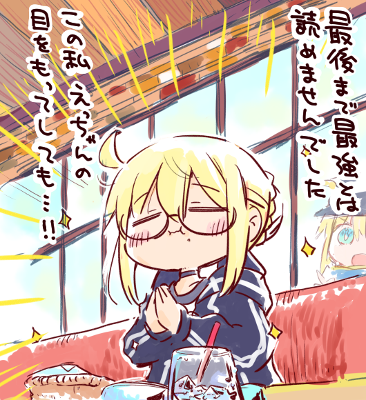 2girls :i ahoge artoria_pendragon_(fate) baseball_cap black_hat black_jacket blonde_hair blue_eyes blue_scarf blush braid chibi closed_eyes closed_mouth drinking_straw emphasis_lines fate/grand_order fate_(series) food food_on_face gym_shirt hair_between_eyes hair_bun hat hood hood_down hooded_jacket ice ice_cube indoors jacket kasuga_yuuki long_sleeves multiple_girls mysterious_heroine_x_alter_(fate) mysterious_heroine_xx_(fate) open_clothes open_jacket palms_together puffy_long_sleeves puffy_sleeves scarf shirt solo_focus sparkle translation_request v-shaped_eyebrows wavy_mouth white_shirt