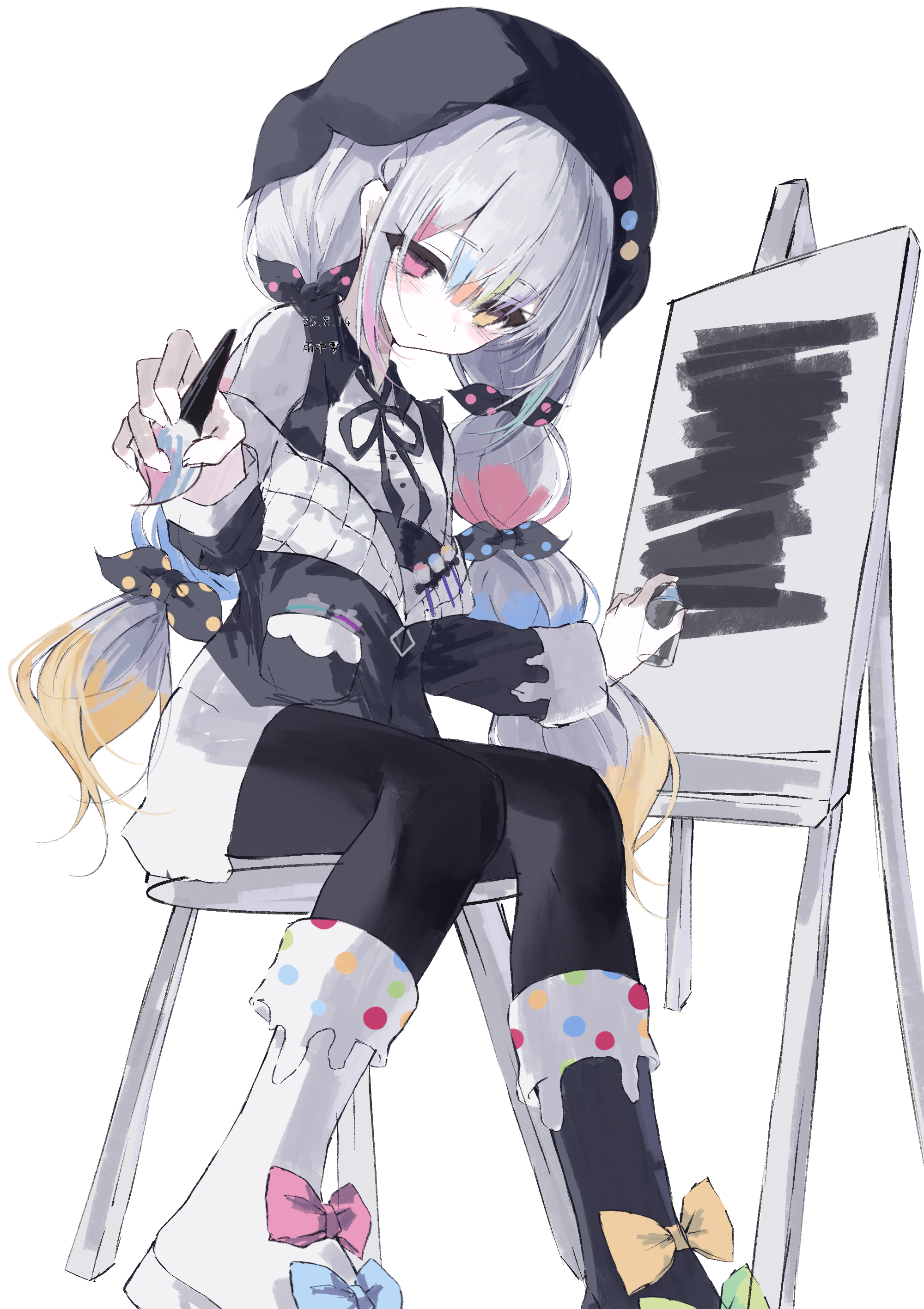1girl absurdres asymmetrical_footwear beret black_boots black_pantyhose black_ribbon boots bow braid canvas_(object) chinese_commentary closed_mouth commentary_request easel empty_eyes expressionless hat heterochromia highres holding holding_paintbrush holding_spray_can jogasaki_noah long_hair long_sleeves looking_at_viewer magical_girl mahou_shoujo_no_majo_saiban mismatched_footwear multi-tied_hair multicolored_hair neck_ribbon off_shoulder paintbrush pantyhose pink_bow ribbon simple_background sitting solo spray_can stool twin_braids white_background white_boots yellow_bow yellow_eyes you_de_cong_yu