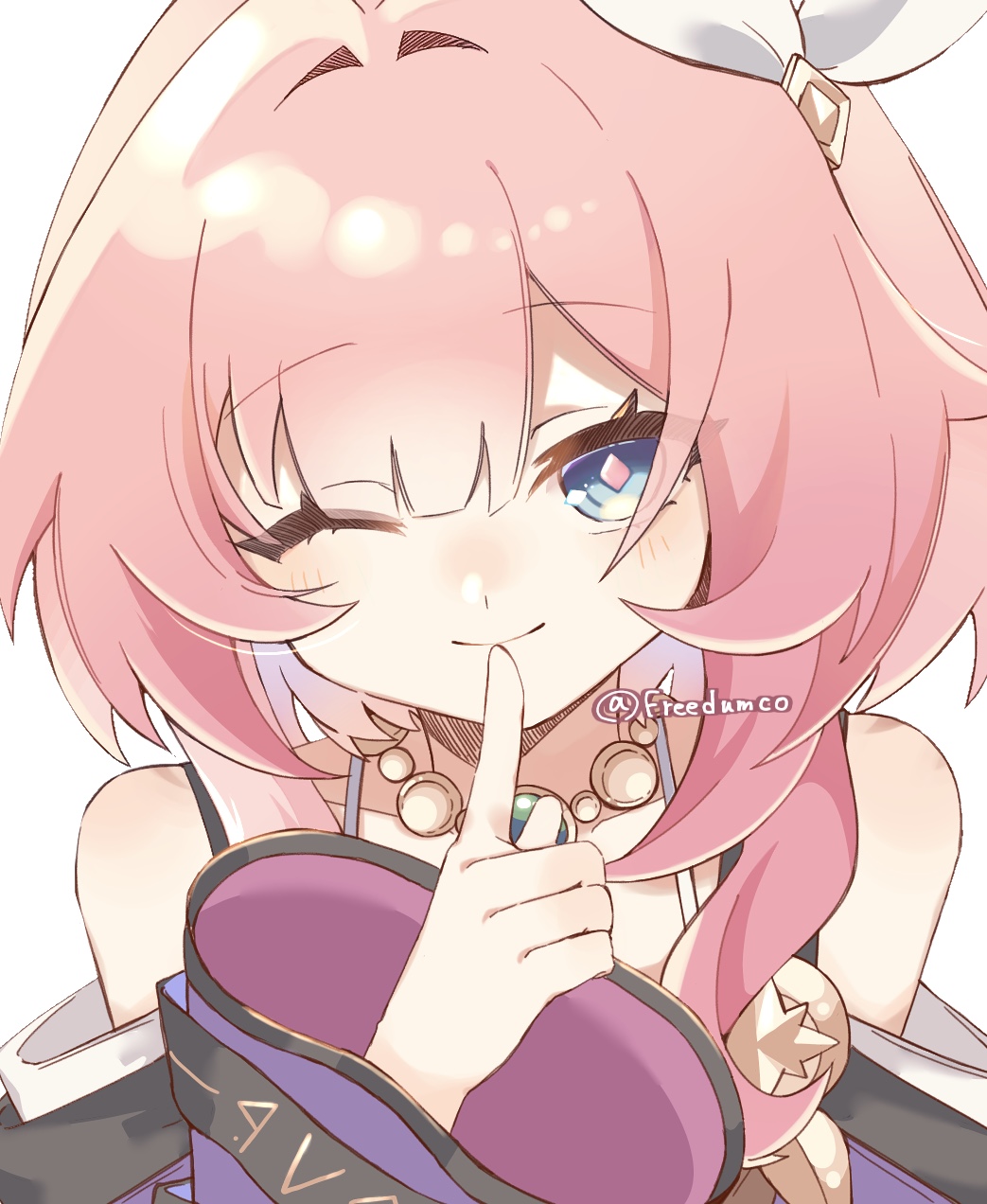 1girl ;) bare_shoulders blue_eyes coat commentary_request cyrene_(philia093)_(honkai:_star_rail) cyrene_(honkai:_star_rail) hair_ornament highres honkai:_star_rail honkai_(series) jewelry light_smile looking_at_viewer necklace one_eye_closed pink_hair purple_coat simple_background smile solo twitter_username white_background yaruco_(freedumco)