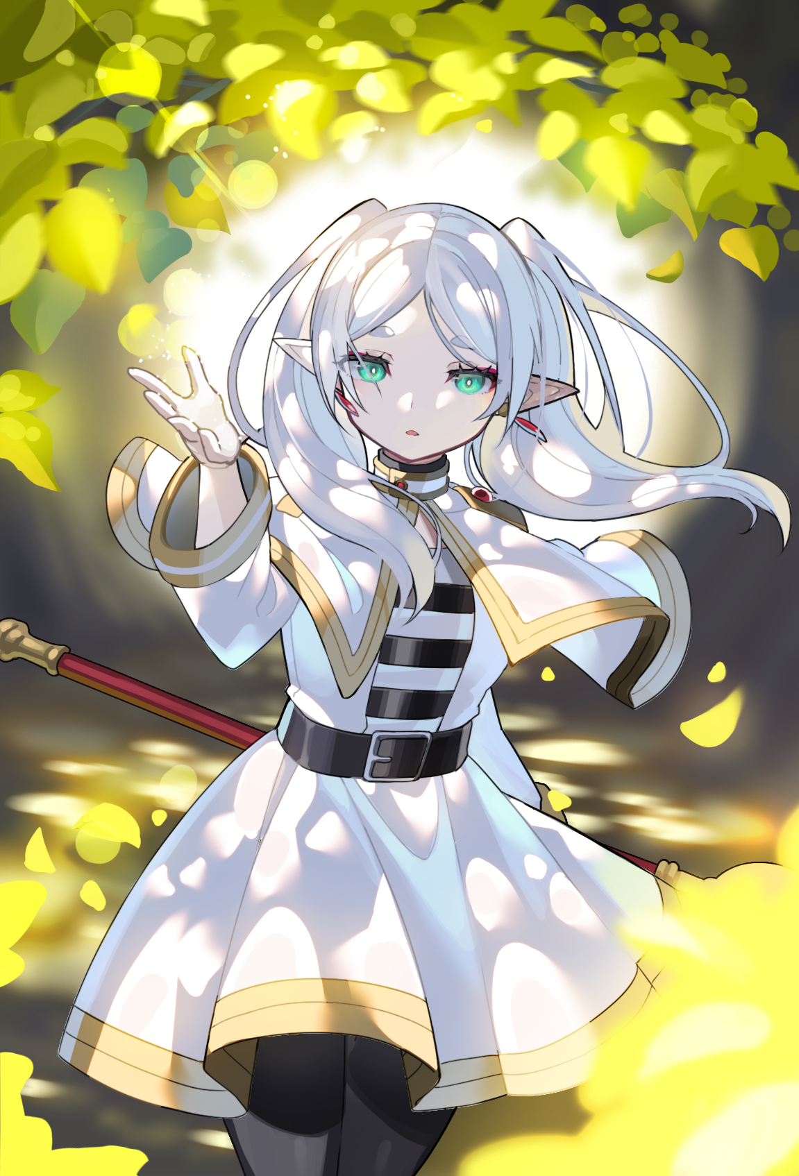 1girl belt black_belt capelet commentary_request earrings elf falken_(yutozin) frieren green_eyes highres holding holding_staff jewelry long_sleeves looking_at_viewer mage_staff petals pointy_ears shirt skirt solo sousou_no_frieren staff striped_clothes striped_shirt white_capelet white_skirt