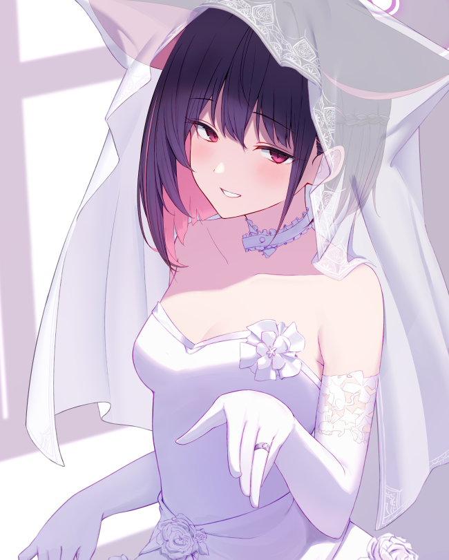 1girl animal_ears black_hair blue_archive bridal_veil bride cat_ears choker colored_inner_animal_ears colored_inner_hair dress extra_ears flower gloves halo jewelry kazusa_(blue_archive) looking_at_viewer multicolored_hair pink_hair pink_halo red_eyes ring rose short_hair solo strapless strapless_dress two-tone_hair veil wedding_dress wedding_ring white_dress white_flower white_gloves white_rose yata_mawari