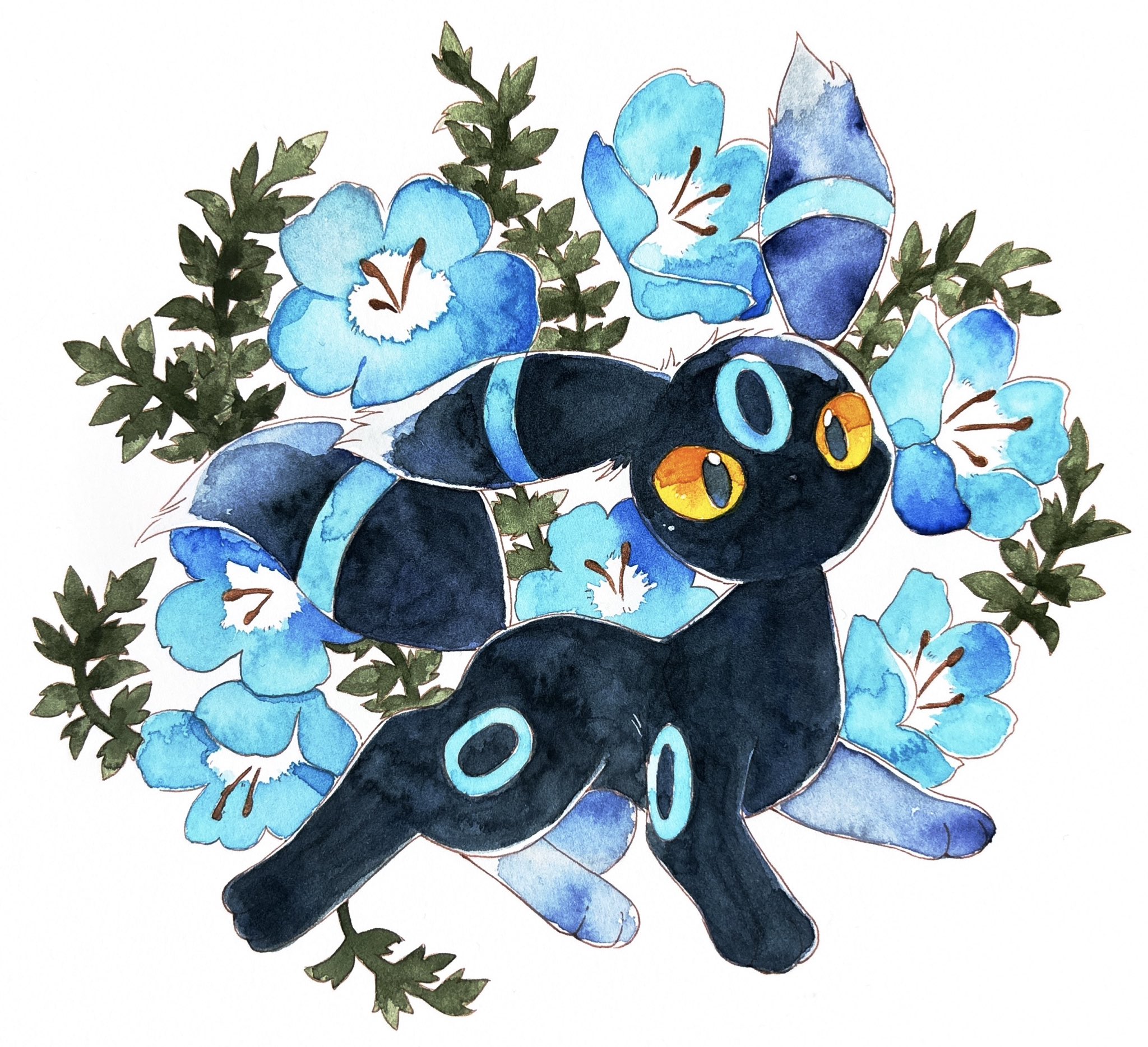 alternate_color black_eyes blue_flower colored_sclera flower gen_2_pokemon highres merino_(merino_9999) nintendo no_humans painting_(medium) pokemon pokemon_(creature) pokemon_focus shiny_pokemon simple_background solo traditional_media umbreon white_background yellow_sclera