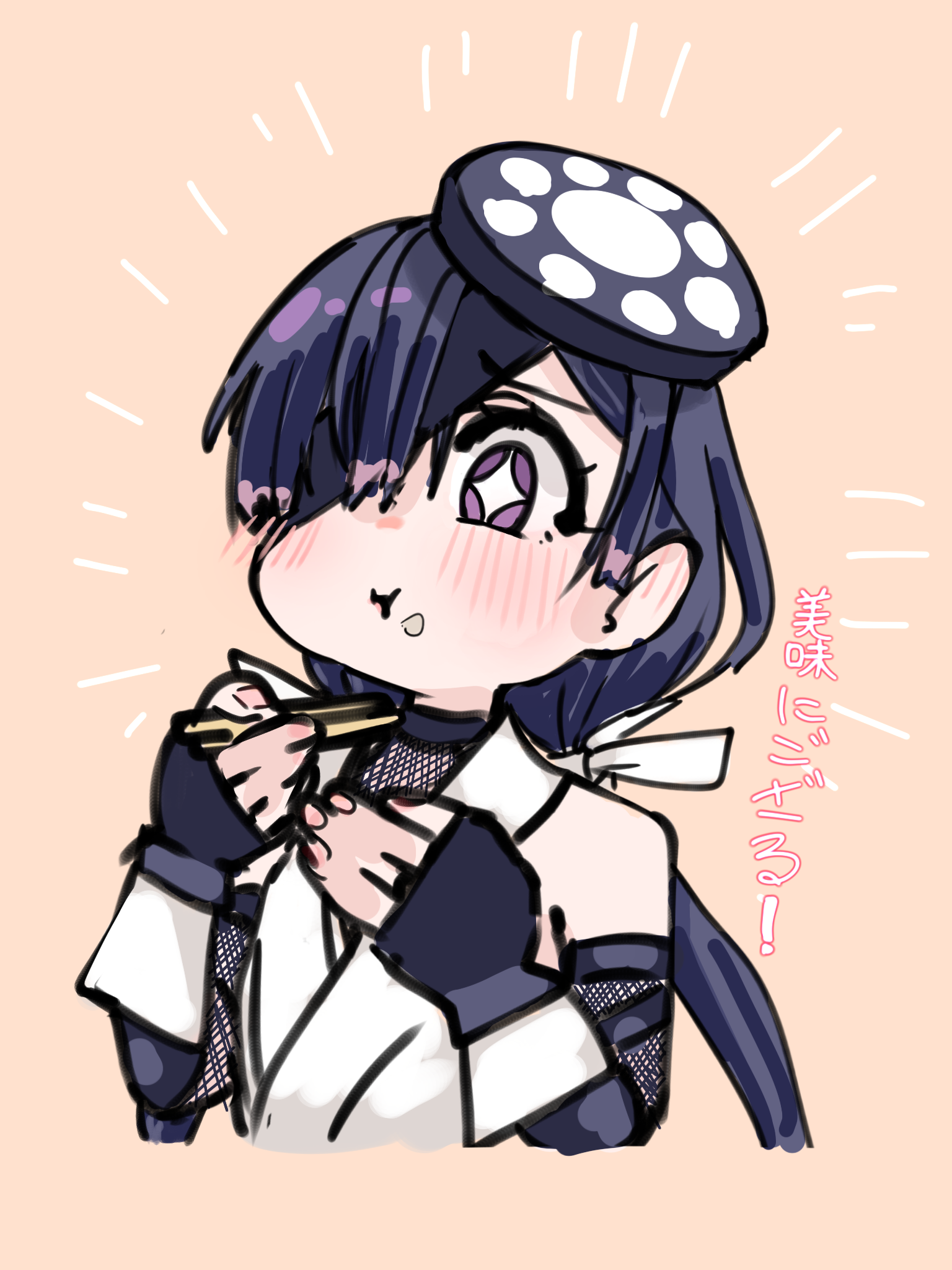 1girl arm_strap bare_shoulders black_hair blush breasts chopsticks eating eyepatch fate/grand_order fate_(series) fishnets hair_ornament highres japanese_clothes kimono long_hair mochizuki_chiyome_(fate) mochizuki_chiyome_(second_ascension)_(fate) niwaikanai purple_eyes sleeveless sleeveless_kimono small_breasts solo sparkling_eyes translation_request very_long_hair white_kimono