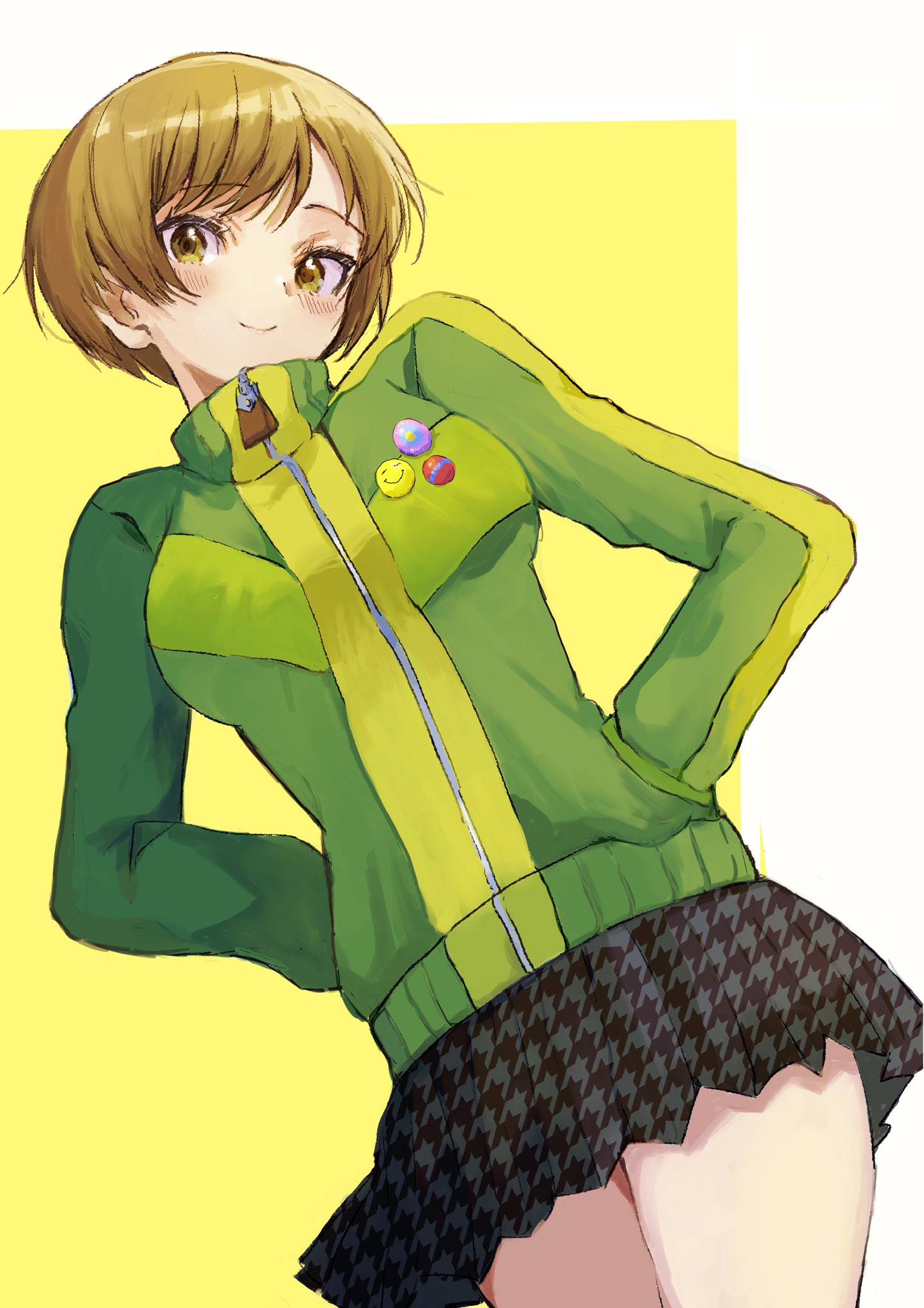 1girl arms_behind_back badge black_skirt breasts brown_eyes brown_hair button_badge closed_mouth commentary_request cowboy_shot green_jacket hands_in_pockets high_collar highres houndstooth jacket kanna_nijiniji light_blush looking_at_viewer medium_breasts persona persona_4 revision satonaka_chie short_hair skirt smile solo zipper_pull_tab