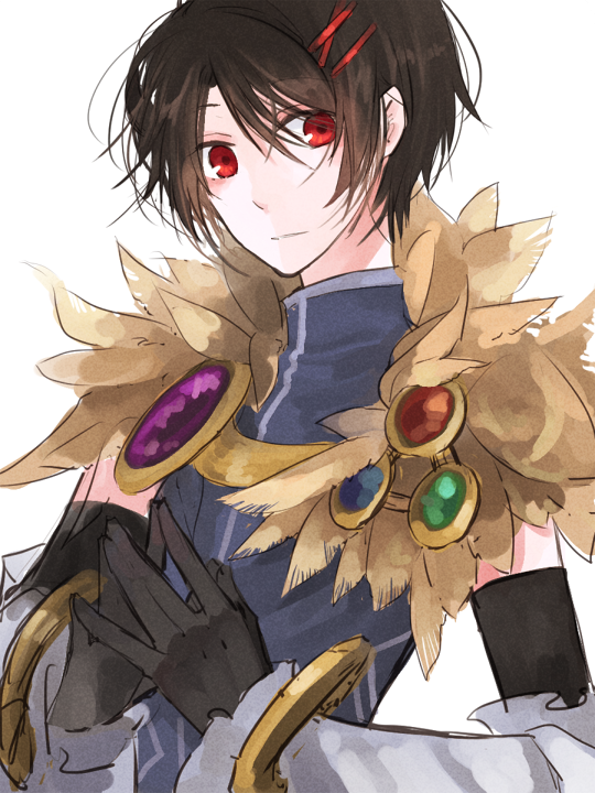 1boy black_gloves black_hair blue_shirt closed_mouth elbow_gloves fur_collar gloves hair_ornament hairclip looking_at_viewer male_focus ragnarok_online red_eyes shirt short_hair simple_background sleeveless sleeveless_shirt smile solo sorcerer_(ragnarok_online) steepled_fingers upper_body wane_(ruki) white_background