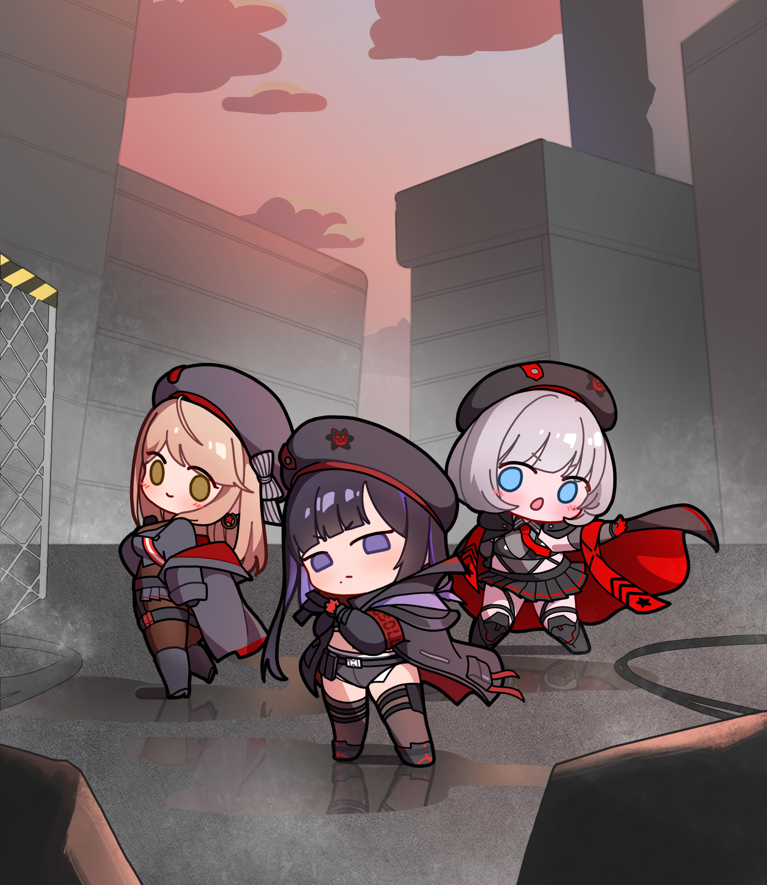 3girls absolute_(nikke) absurdres armband black_gloves black_hair black_jacket black_skirt blue_eyes blunt_bangs blush bodysuit boots breasts building cape chibi cloud colored_inner_hair commentary earrings emma_(nikke) emma_(tactical_upgrade)_(nikke) eunhwa_(nikke) eunhwa_(tactical_upgrade)_(nikke) frown gloves goddess_of_victory:_nikke green_eyes grey_hair hand_on_own_hip hands_up hashtag-only_commentary highres jacket jewelry jitome large_breasts leotard long_hair long_sleeves looking_at_viewer midriff mole mole_under_mouth multicolored_gloves multicolored_hair multiple_girls navel necktie off_shoulder official_alternate_costume open_clothes open_jacket open_mouth orange_hair outdoors outstretched_arm panties pleated_skirt puddle purple_eyes purple_hair red_armband red_gloves red_sash reflection reflective_liquid sash short_hair shorts side_part skirt sleeveless smile strap sunset thighhighs underwear uz_(uzru0428) vesti_(nikke) vesti_(tactical_upgrade)_(nikke) wing_collar