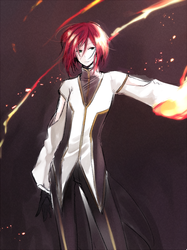 1boy black_gloves black_pants blue_eyes brown_background closed_mouth commentary_request cowboy_shot expressionless fire gloves green_eyes hair_between_eyes looking_at_viewer male_focus pants pyrokinesis ragnarok_online red_hair shirt short_hair solo wane_(ruki) warlock_(ragnarok_online) white_shirt