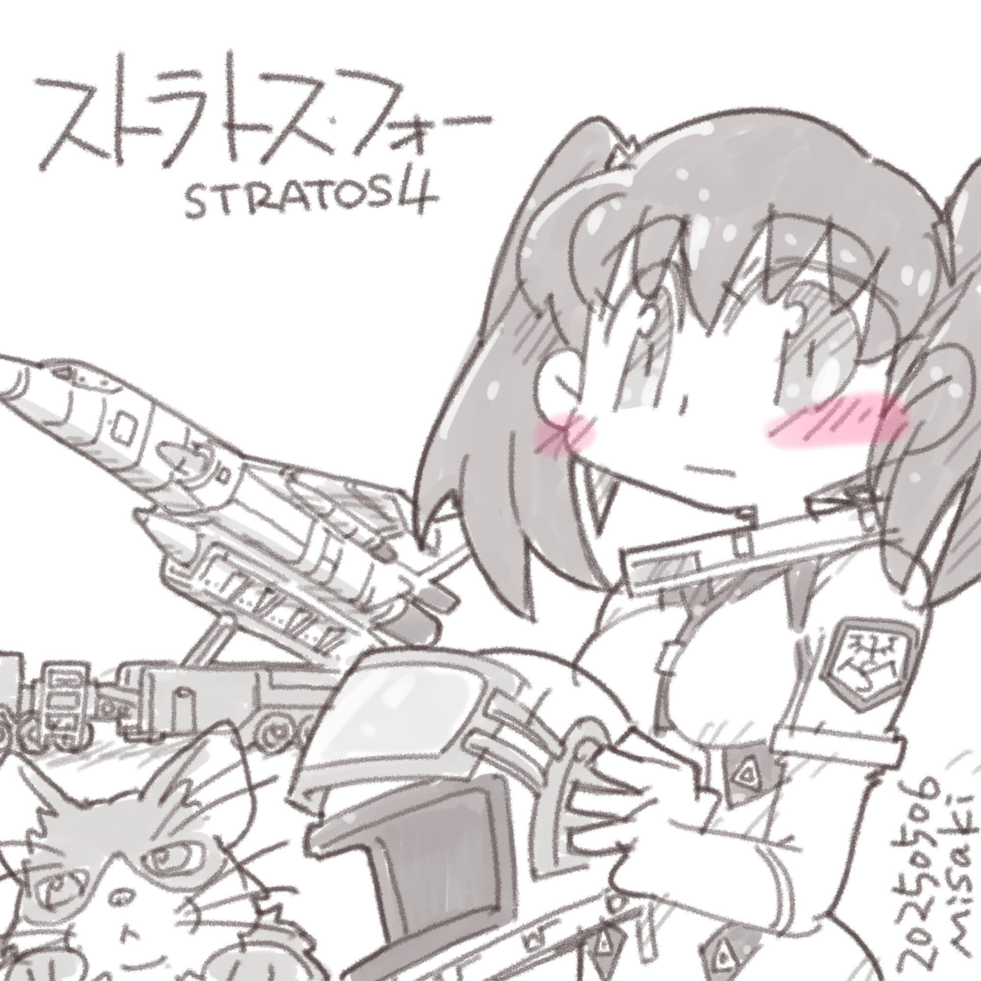 1girl 2025 :/ admiral_(stratos_4) artist_request breasts cat curvy dated helmet highres holding holding_unworn_helmet honjou_mikaze long_hair looking_at_viewer monochrome pilot_helmet shiny_clothes simple_background skin_tight smile spacesuit stratos_4 title twintails unworn_headwear unworn_helmet wide_hips