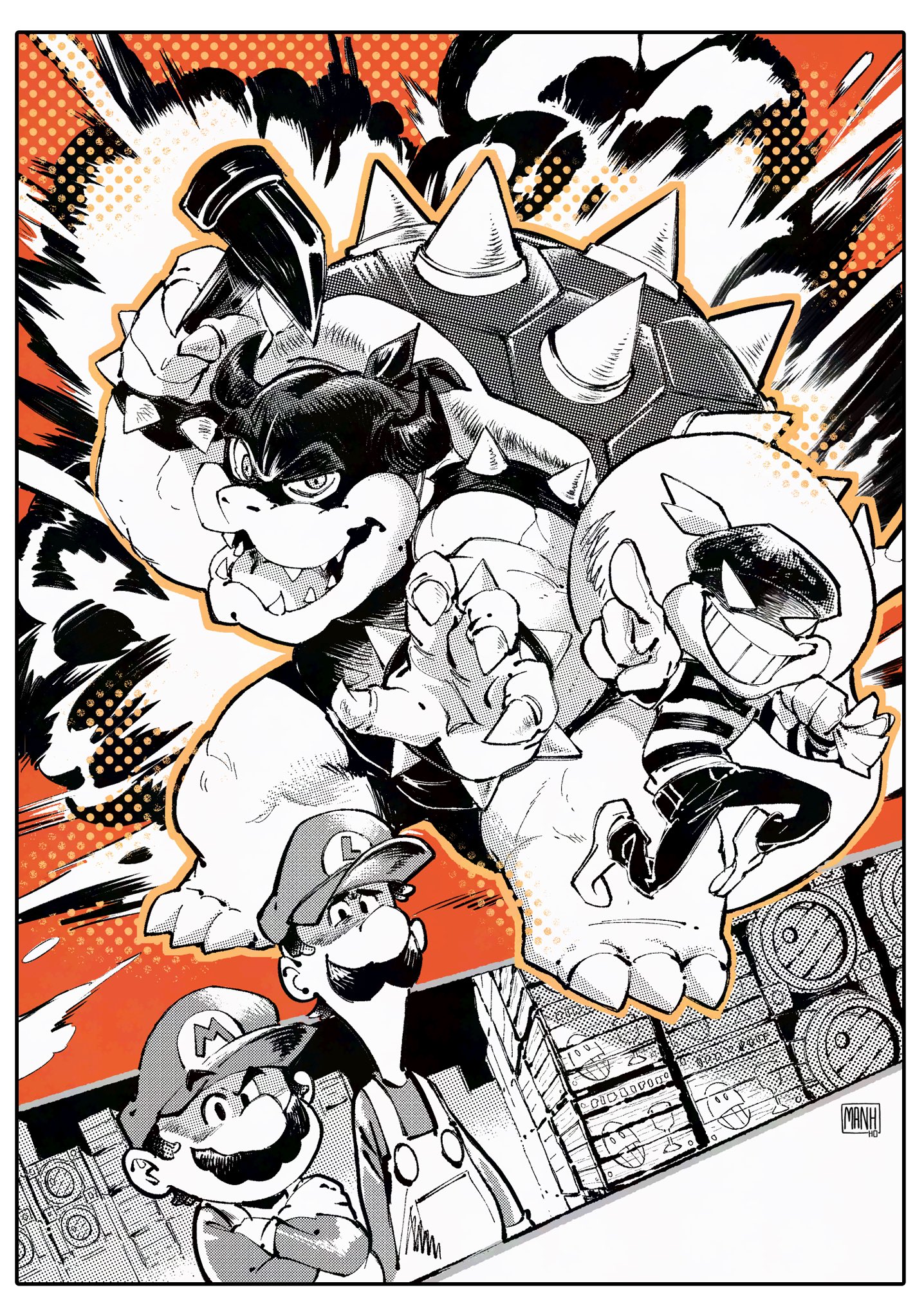 4boys bag barrel bowser bracelet brothers claws crate crossed_arms dutch_angle explosion explosion_background facial_hair full_body gloves greyscale grin hammer hat highres index_finger_raised jewelry looking_at_another lugii mario mario_&_luigi:_superstar_saga mario_&_luigi_rpg mario_(series) mask monochrome multiple_boys mustache ngmanhho nintendo overalls popple_(mario) raised_eyebrow siblings smile spiked_bracelet spikes spot_color upper_body
