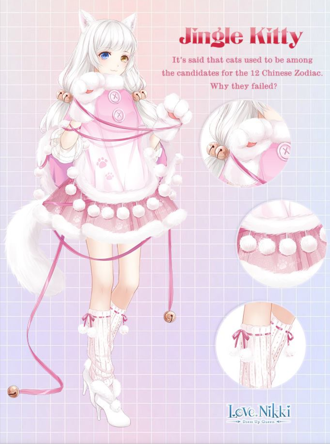 1girl animal_ears animal_hands arm_ribbon artist_request bell blue_eyes boots cat_ears cat_girl cat_tail character_name close-up colorful_background copyright_name english_text eyelashes frilled_sleeves frills full_body fur-trimmed_boots fur-trimmed_poncho fur-trimmed_skirt fur_trim gloves gradient_poncho grid_background hair_bell hair_ornament happy heterochromia high_heel_boots high_heels highres jingle_kitty_(miracle_nikki) kneehighs knees logo long_hair long_sleeves looking_at_viewer loose_socks miniskirt miracle_nikki nikki_(series) official_art paw_gloves paw_pose paw_print paw_print_pattern pink_poncho pink_ribbon pink_shirt pink_skirt pleated_skirt pom_pom_(clothes) puffy_long_sleeves puffy_sleeves ribbon ribbon-trimmed_socks ribbon_legwear ribbon_trim shirt skirt socks solo standing stiletto_heels striped_clothes striped_socks tail three-quarter_sleeves two-tone_poncho vertical-striped_clothes vertical-striped_socks wavy_hair white_boots white_gloves white_hair white_poncho white_socks yellow_eyes