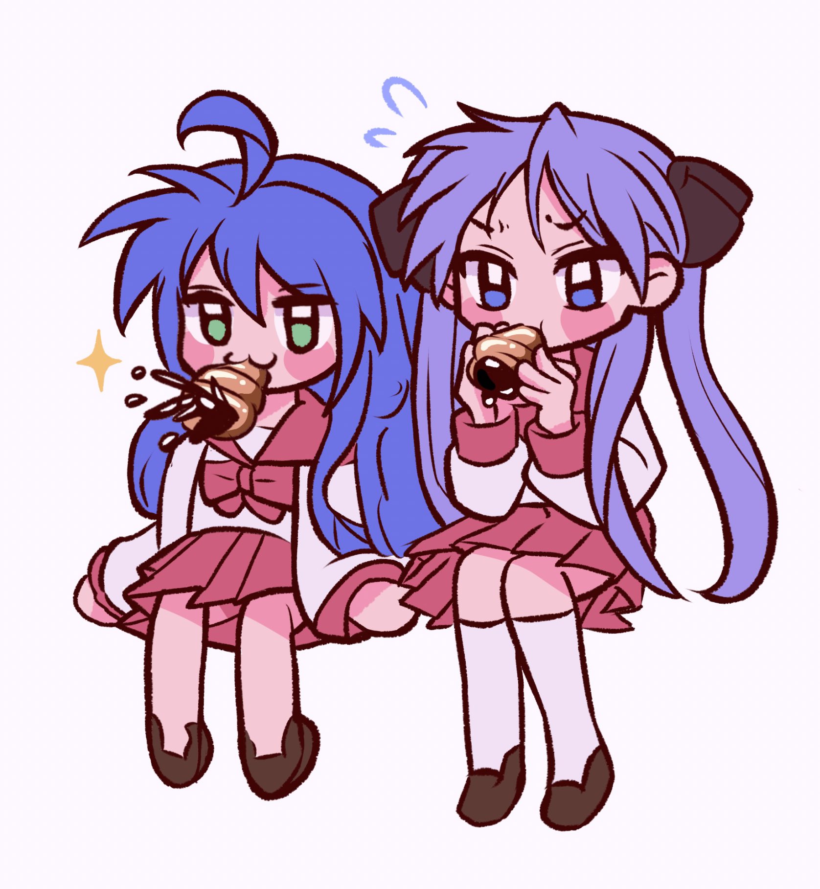 2girls :3 black_bow black_shoes blue_eyes blue_hair blush bow chocolate_cornet eating flying_sweatdrops food green_eyes hair_bow highres hiiragi_kagami holding holding_food invisible_chair izumi_konata keropiki lucky_star multiple_girls pleated_skirt purple_hair red_sailor_collar red_skirt ryouou_school_uniform sailor_collar school_uniform shoes sitting skirt socks twintails white_socks
