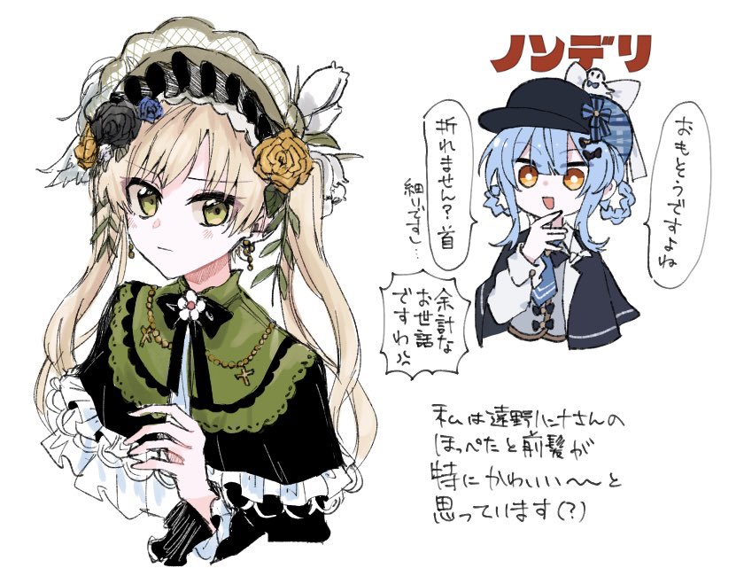 2girls bird_hat_ornament black_capelet black_dress black_flower black_rose blonde_hair blue_bow blue_bowtie blue_flower blue_hair blue_rose bonnet bow bowtie braid braided_hair_rings capelet commentary_request cross dress earrings flower frilled_dress frills green_eyes grey_shirt hair_rings hand_on_own_face jewelry lolita_fashion looking_at_viewer magical_girl mahou_shoujo_no_majo_saiban multiple_girls open_mouth orange_eyes rose shirt simple_background smile tachibana_sherry tono_hanna translation_request twintails upper_body white_background white_bow white_flower white_rose yellow_flower yellow_rose yume_mogura